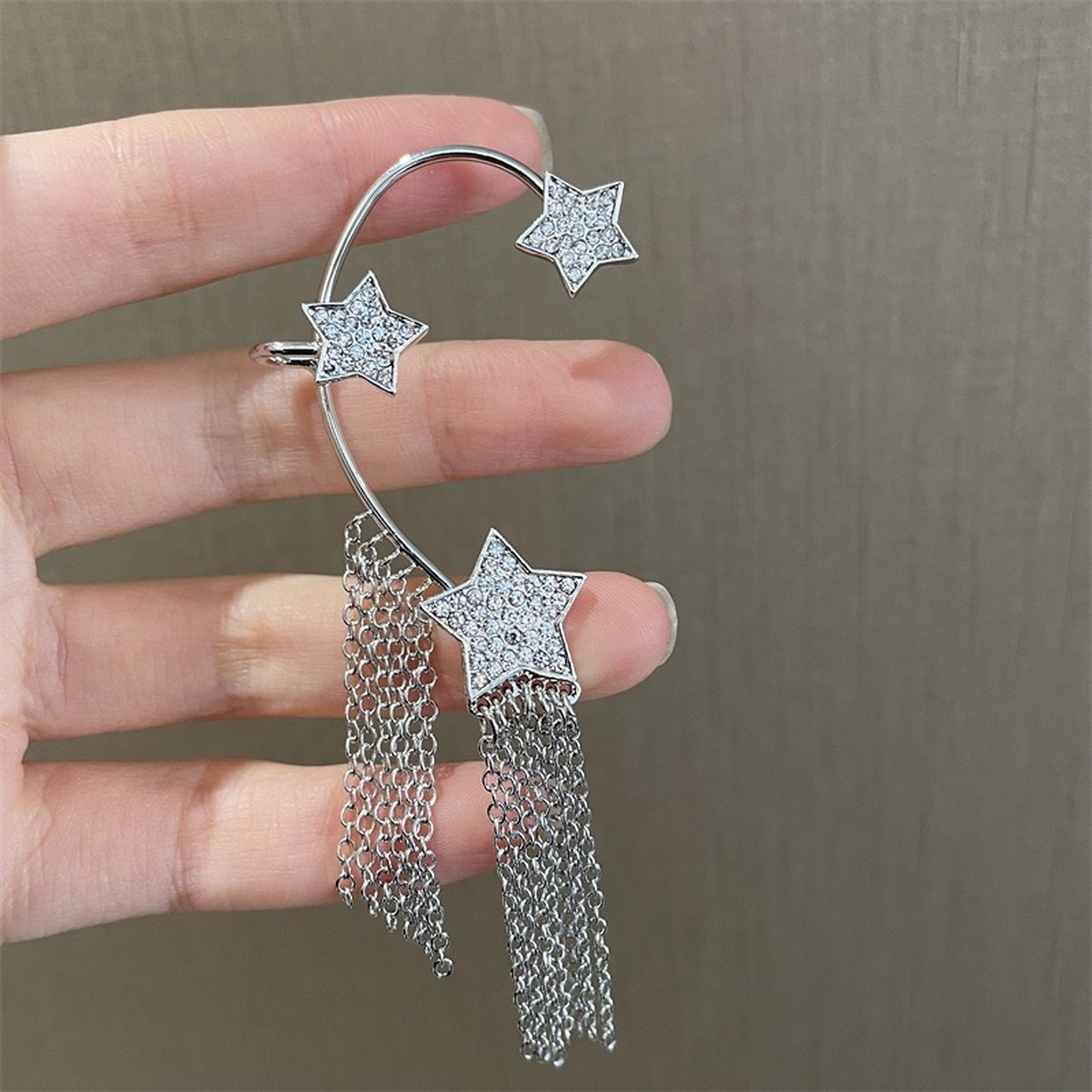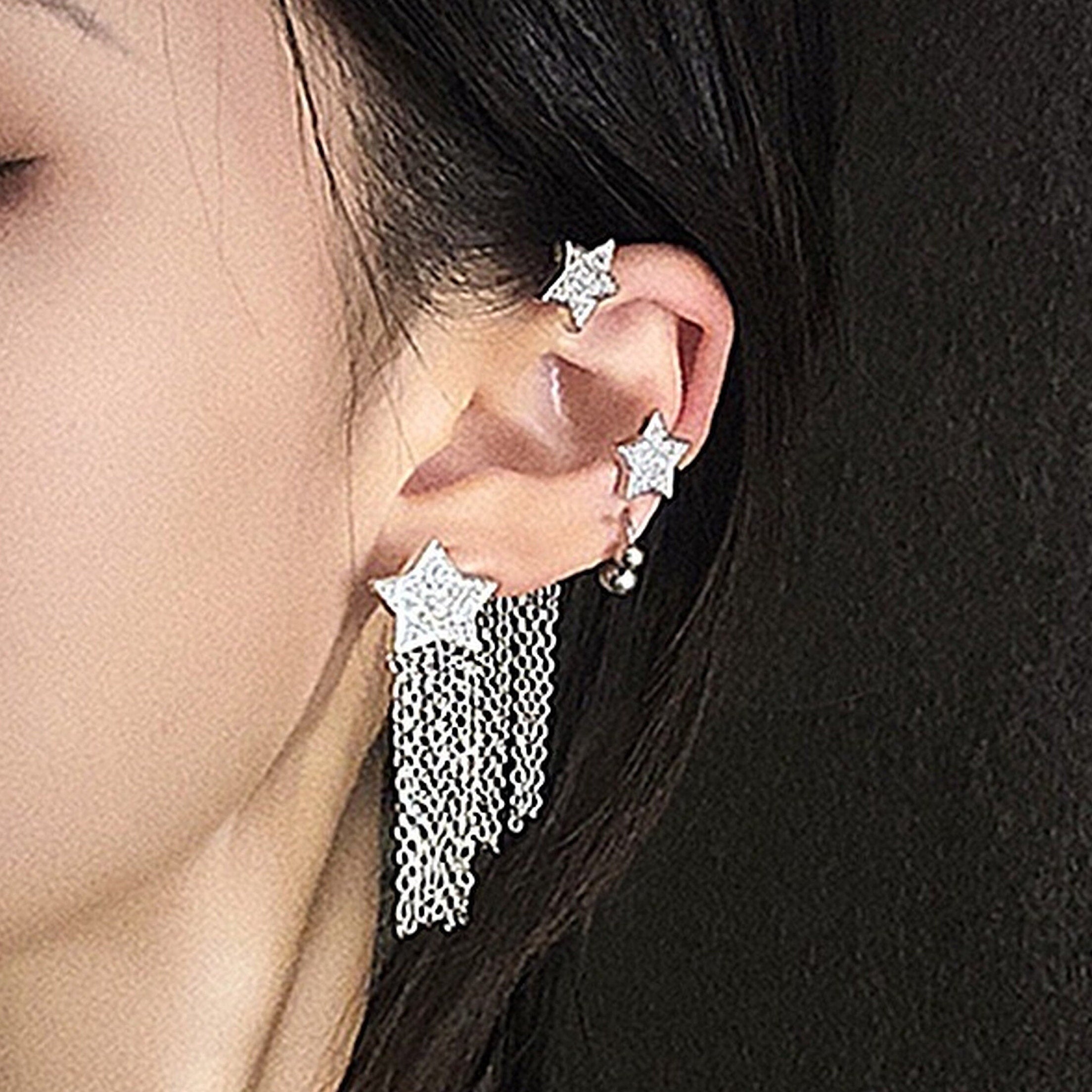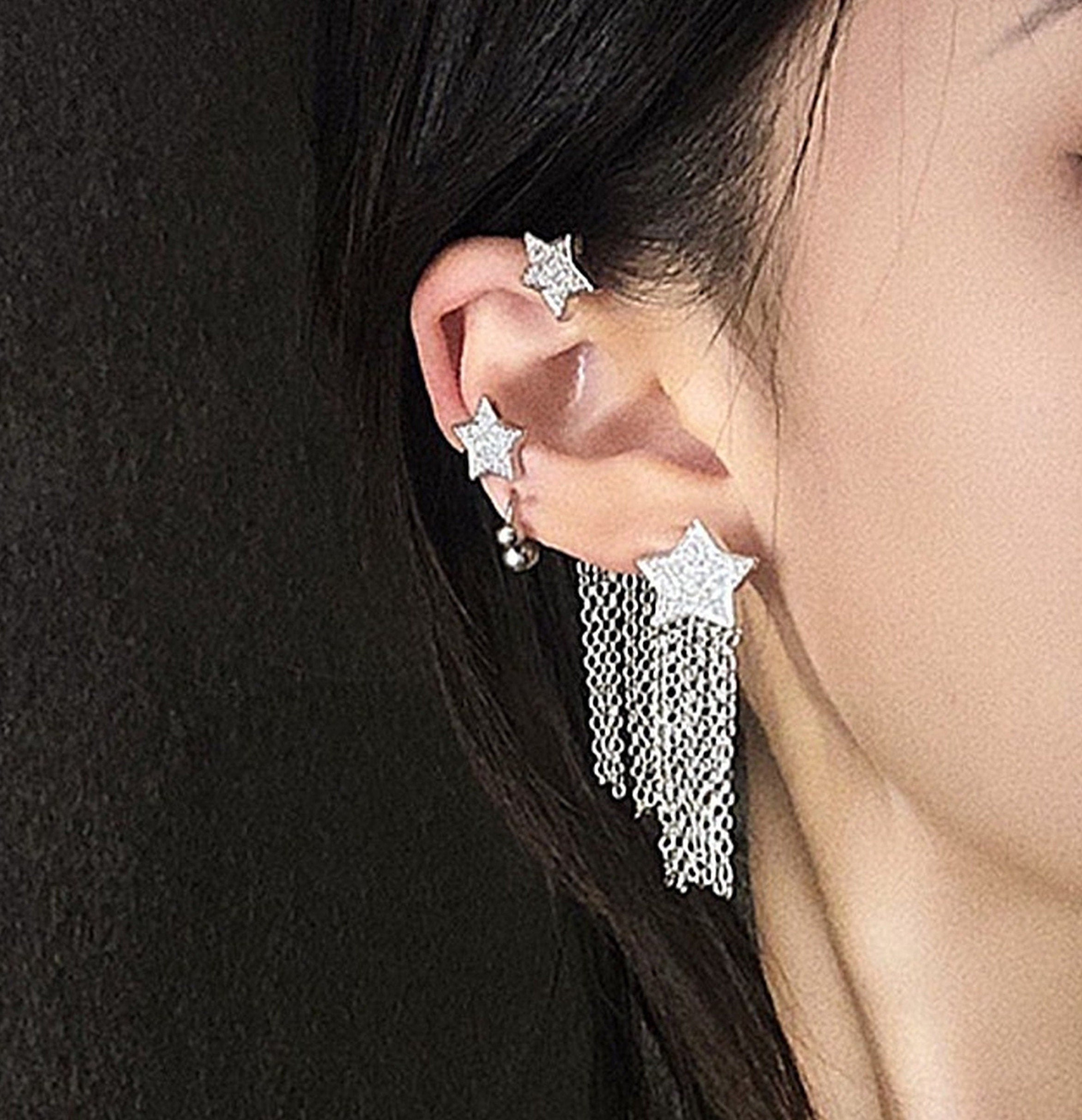 Delicado pendiente de plata con borlas celestiales y estrellas, sin perforaciones, con cadena colgante para trepar. Estrellas brillantes que se arrastran sobre la caracola y el cartílago. Con borlas con flecos colgando. ¡Absolutamente lindo y vanguardista! No necesita orificio para la oreja. Fácil de usar y ajustar a tu gusto. Pendientes únicos y llamativos. Realza tu estilo de moda sin esfuerzo. Se vende por unidad.