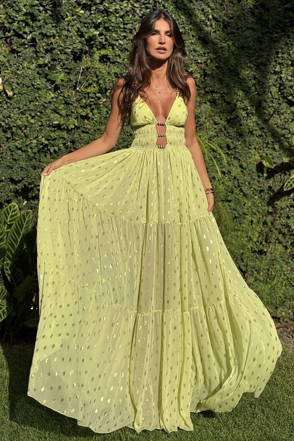 The Dress is the definition of glamour and sophistication. Made from a light. flowing fabric. this dress charms with its impeccable fit and delicate gold polka dot print. which adds a subtle and elegant shine to the piece. With a deep neckline and strategic cutouts. it enhances the silhouette in a sophisticated way. while its flowing skirt provides movement and lightness. Ideal for special events. such as weddings. parties and sophisticated dinners.