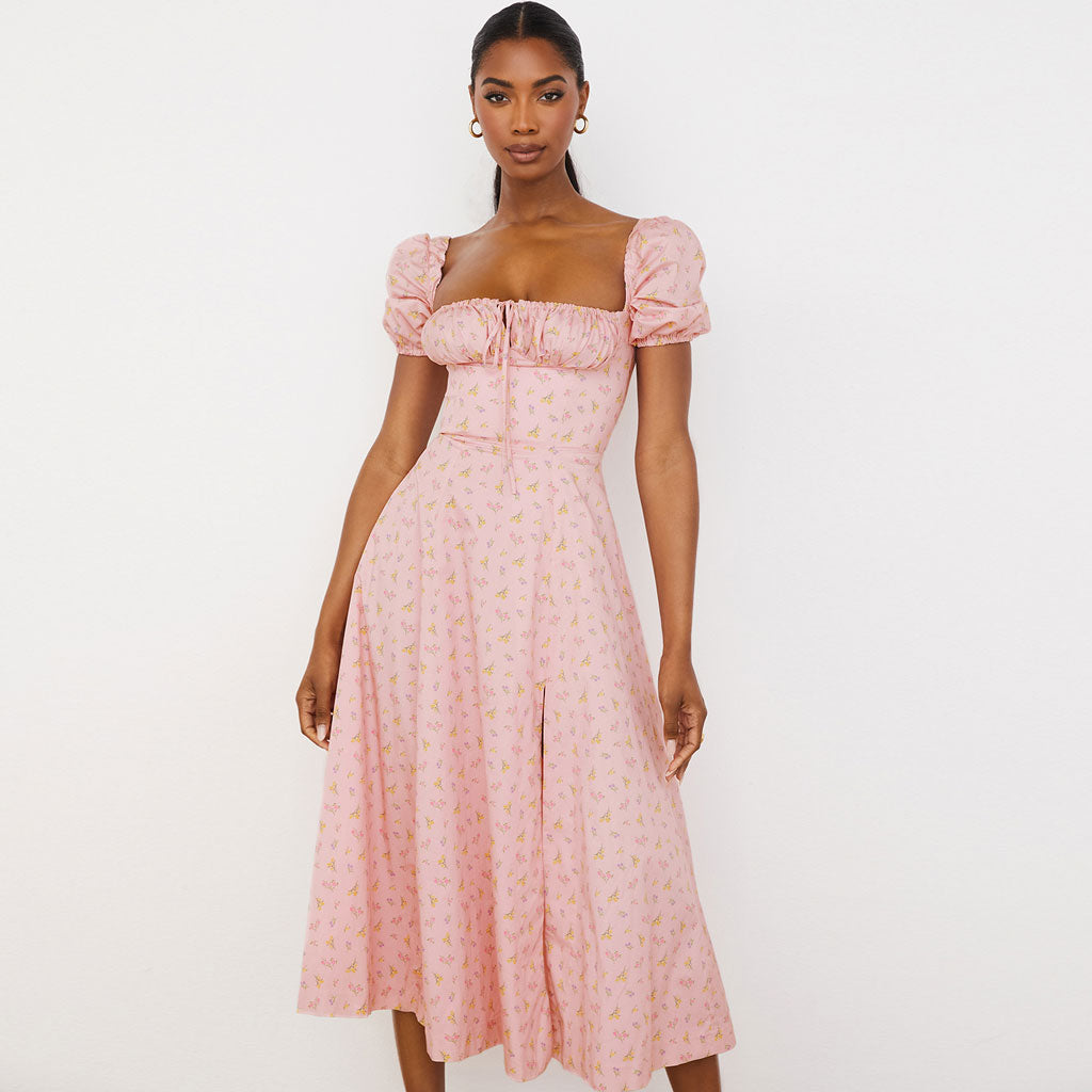 Atrévete a arriesgarte un poco con este bonito y sexy vestido veraniego estampado. Fabricado en mezcla de algodón y poliéster. Destaca por sus estampados de flores. Presenta un escote cuadrado estructurado con un cordón fruncido y un escote en forma de cerradura en el pecho. Un corte ajustado y acampanado con mangas abullonadas elásticas cubiertas. Un cierre de cremallera en la parte trasera. Y un largo especialmente largo acentuado con una espectacular abertura lateral. Encuentra más vestidos de verano para mujer únicos o ropa de moda en nuestra boutique. Y completa un dulce estilo francés con sandalias altas en los días soleados o ponte una chaqueta y botas de tacón en otoño e invierno.