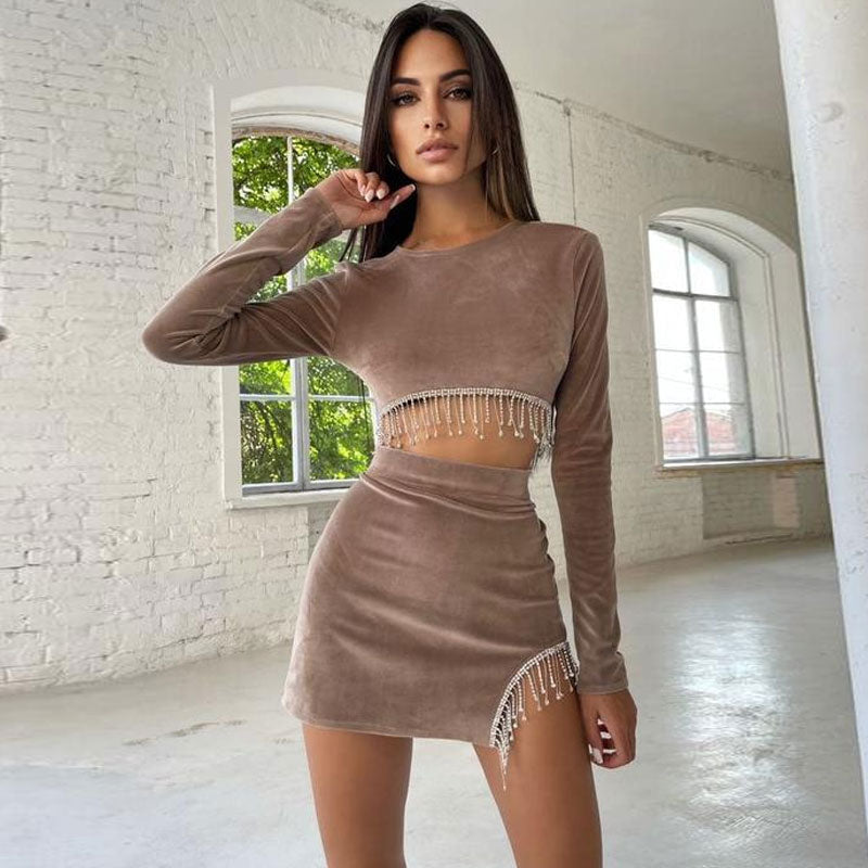 Conjunto de falda corta de terciopelo con flecos y recortes de diamantes de imitación - Caqui