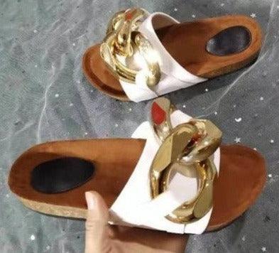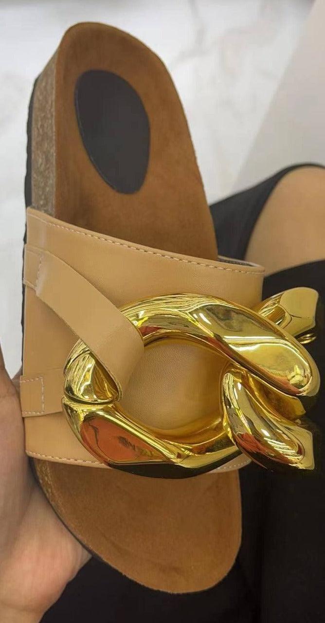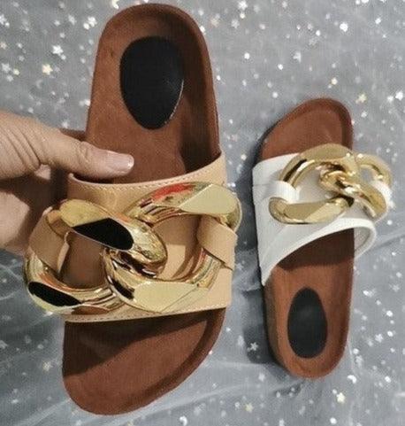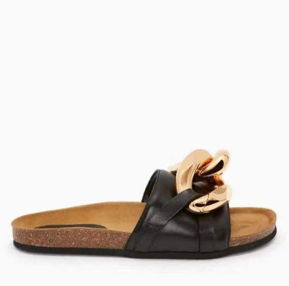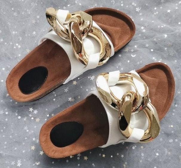 Zapatillas de tacón plano con puntera abierta y cadena de metal