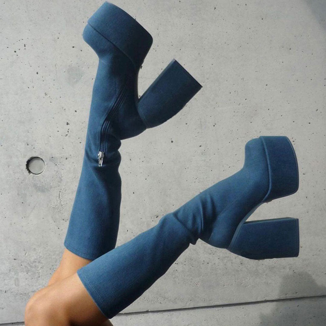 Estas botas altas por debajo de la rodilla seguramente despertarán la diva que llevas dentro. Elaboradas con una mezcla de mezclilla y goma. Adornadas con un tacón resistente. Presentan una punta cuadrada cerrada de almendra seguida de una plataforma alta. Plantilla acolchada. Perfil ligeramente holgado adornado con adornos de pespuntes. Cierre de cremallera en el lateral. Rematadas con un parche de goma. Encuentra más botas y zapatos de mujer a la altura de la rodilla de moda en nuestra boutique. Y úsalos con un vestido lencero y un bolso tote. Altura del tacón: 13 cm.