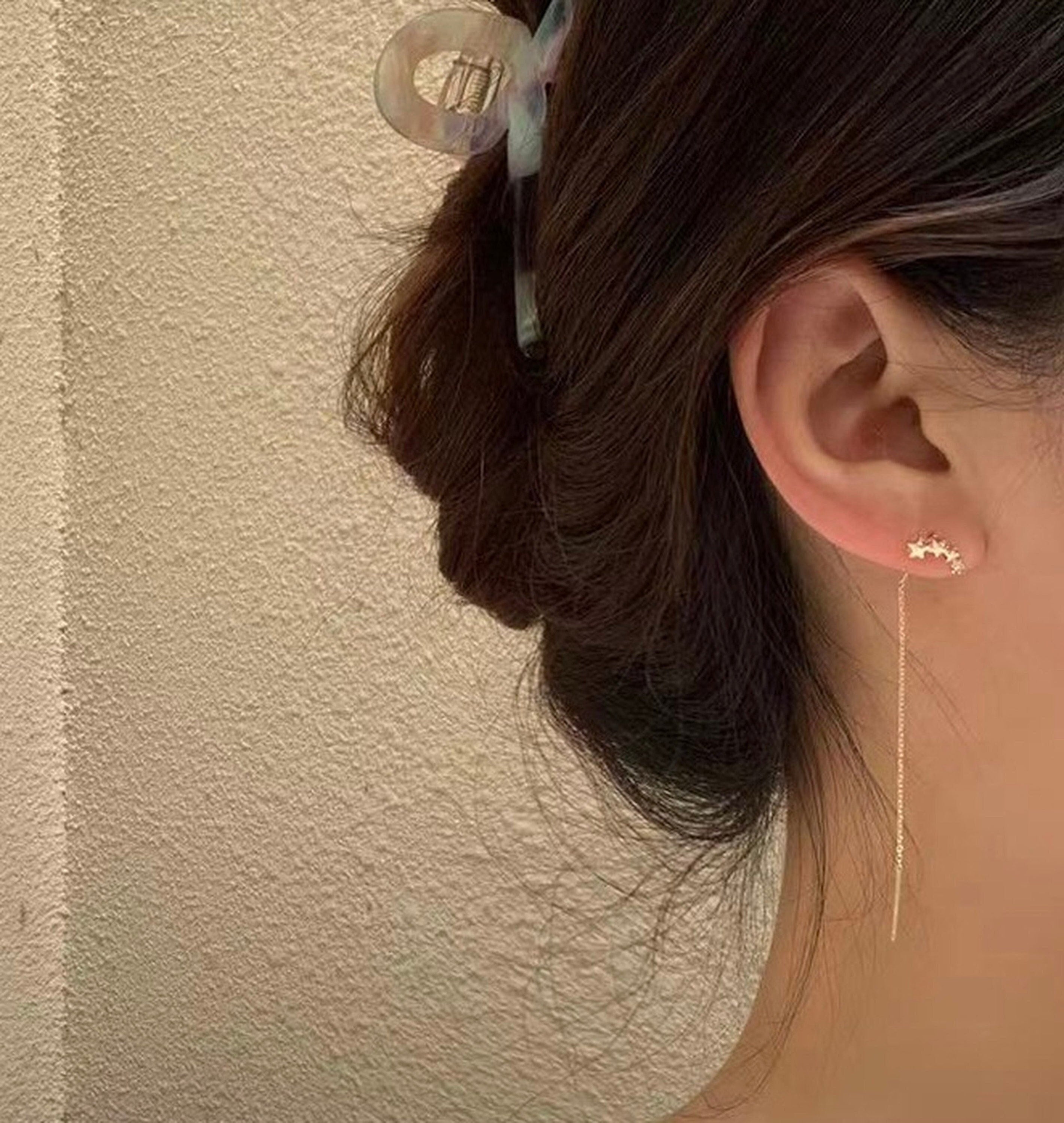 Dainty silver starburst celestial ear threaders. long threader earrings. Delicate star cluster. one star paved with rhinestone cz. minimalist style ear threaders. Subtle elegant design. looks chic and timeless. Handmade of 925 sterling silver. goes perfect with any outfit.