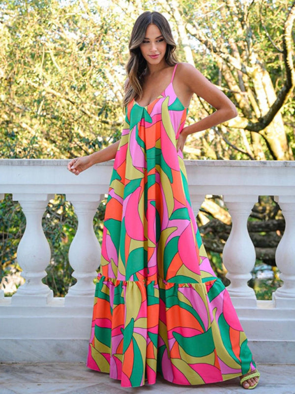 Deep V Backless Dress Bohemian Floral Suspender Long Skirt