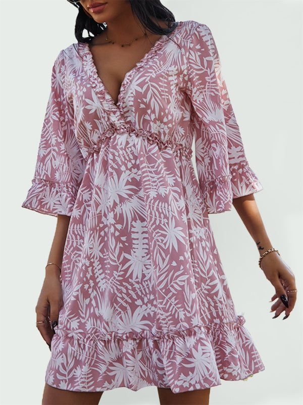 Deep V Casual Sexy Holiday Print Dress Mid Skirt. Please use the size guide shown in our pictures. Before choosing a size. please read each element of the size guide carefully. Unique design. classic style. casual and comfortable. It is suitable for outing and leisure. The size is measured manually. and the error of 1-3cm is normal.