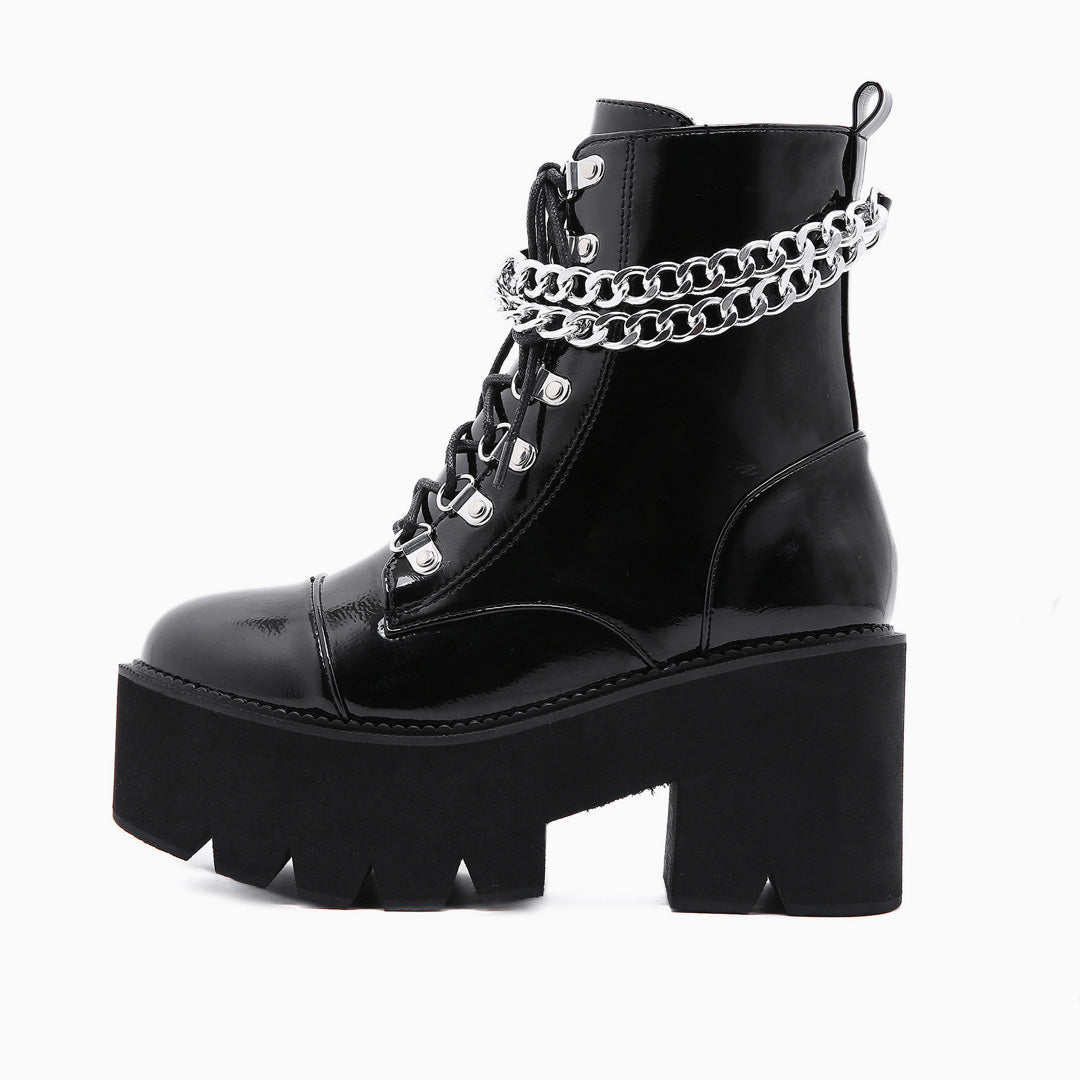This pair of combat boots is a punk update to the classic platform heel style. Crafted with PU leather and rubber. embellished with lace-up closure and decorative metal chains at the vamp. featuring an ankle-height topline presented in solid black. round toe styling tailored with a zipped fastening to one side. and grounded on extra thick. serrated lug rubber soles. Find more unique women's boots and trendy shoes in our boutique. and don tea dresses with the stylish boots for a subtly sculpted look- Heel height:8 cm.