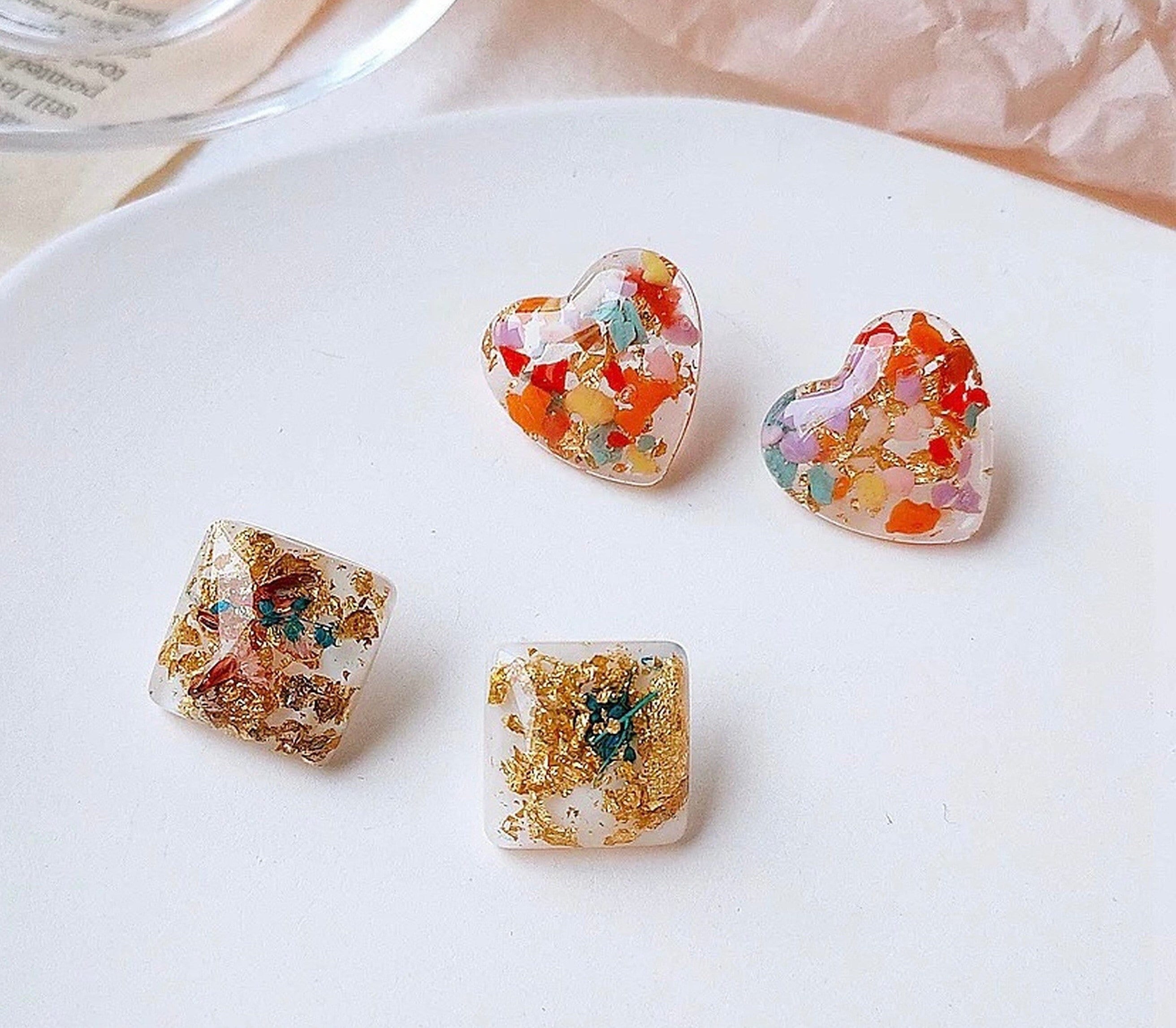 Handmade beautiful dried pressed flower resin stud earrings. in heart/square shaped options. Delicate rainbow dry flower and gold foil leaf pressed inside clear resin. Each pressed dried flower/gold leaf is unique!
