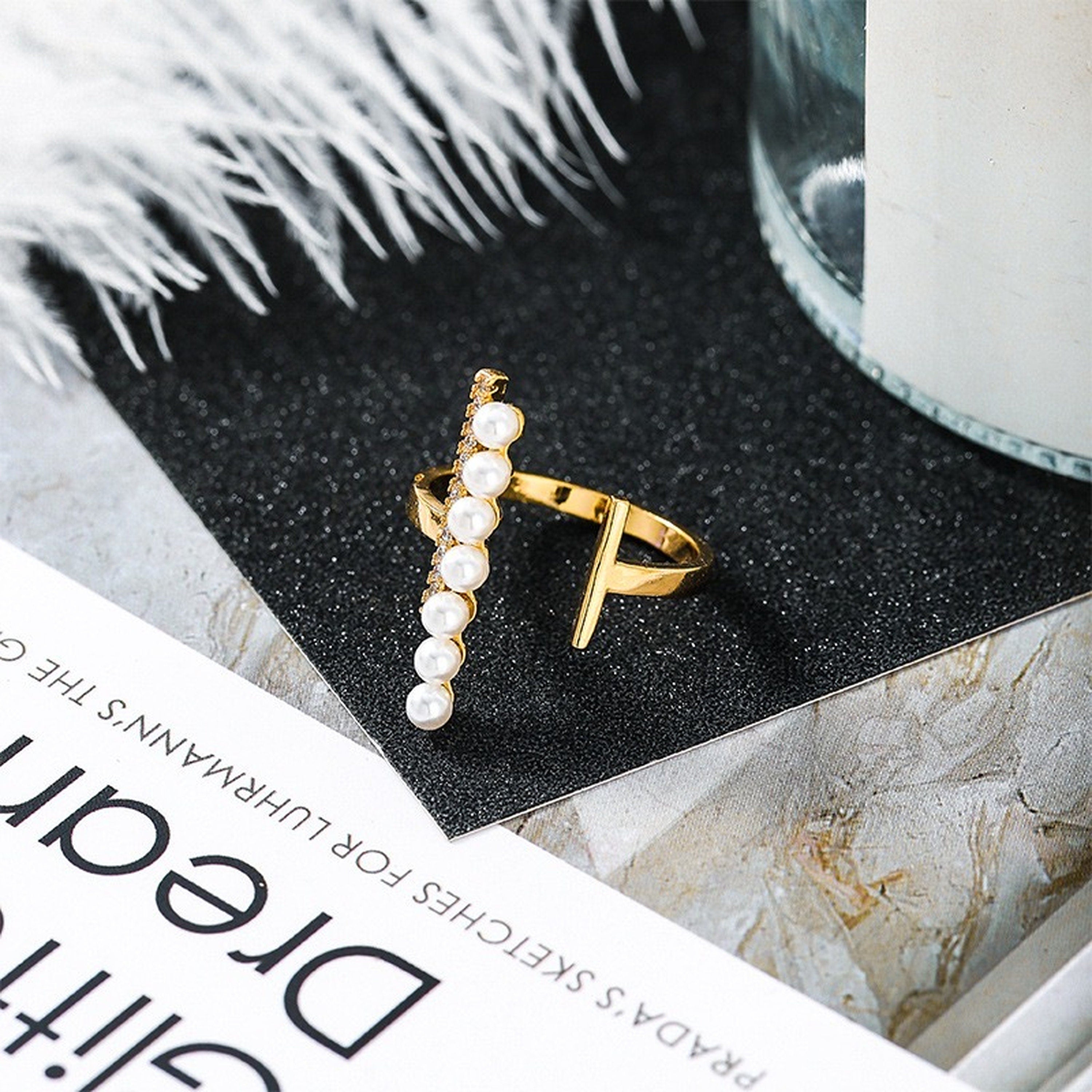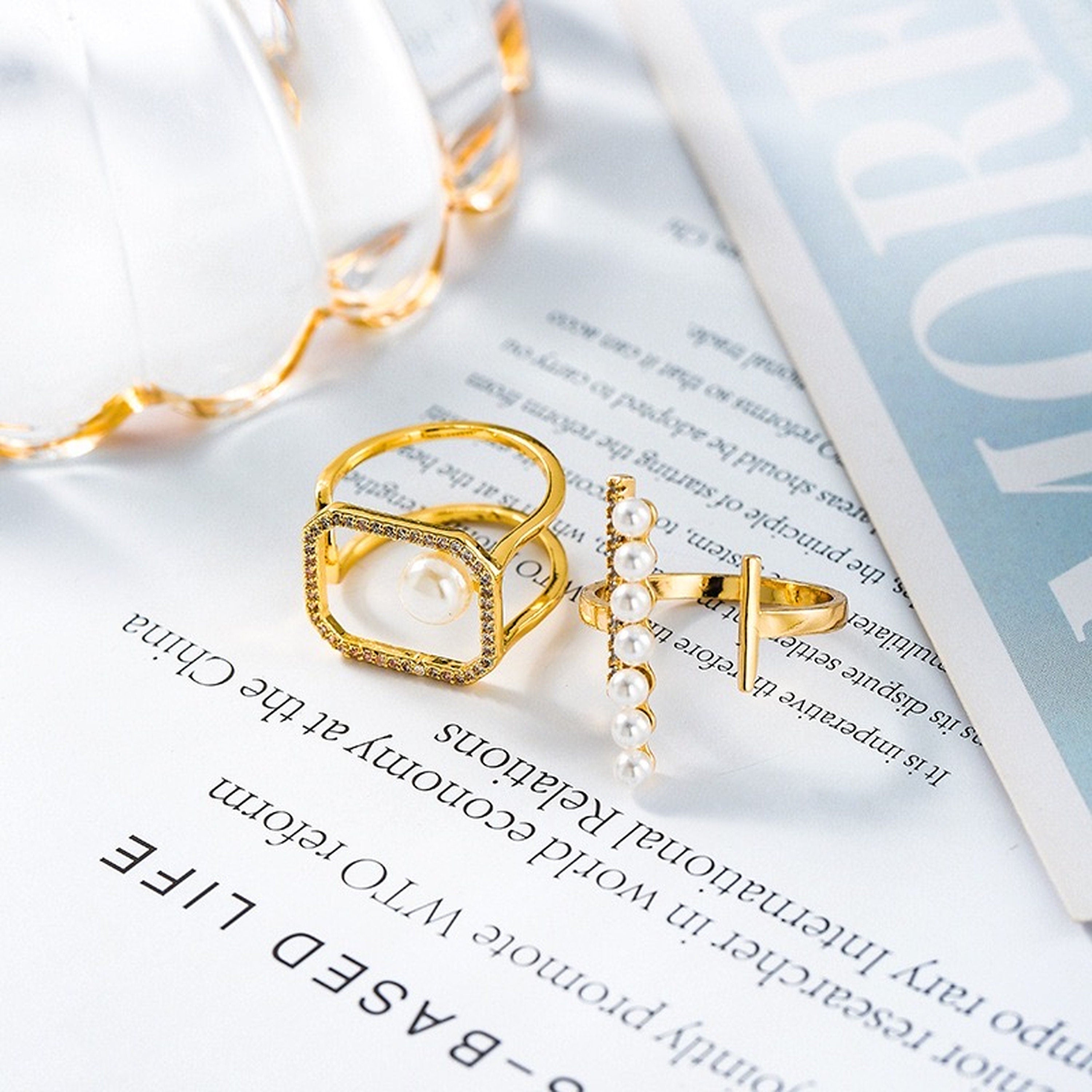 Avant garde unisex geometrical gold and pearl rings. Modern minimalism. edgy hallowed out designs. delicate and unique. Open and adjustable band. fit US 4-10. Perfect for everyday mix and match. stylish cocktail statement stacking rings.