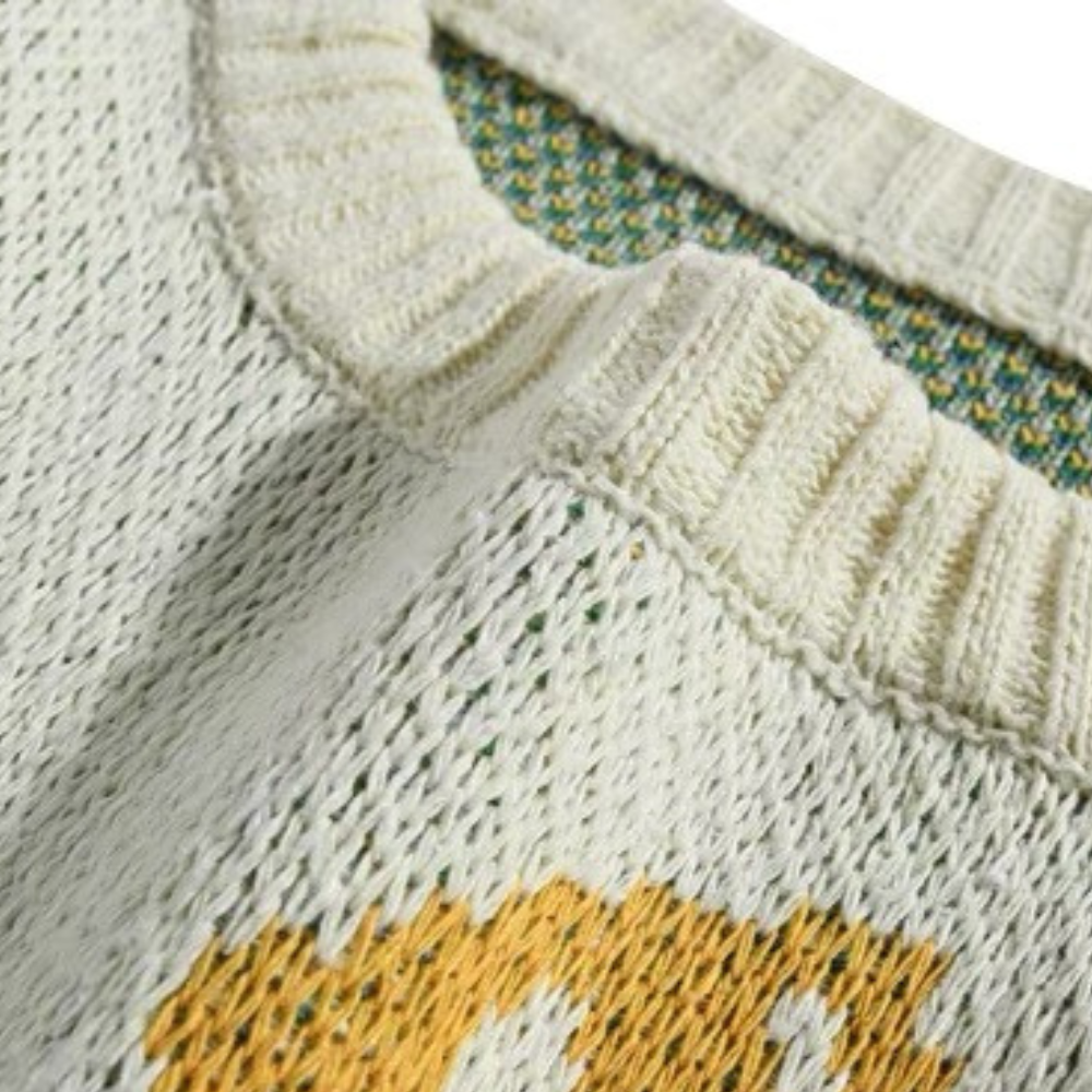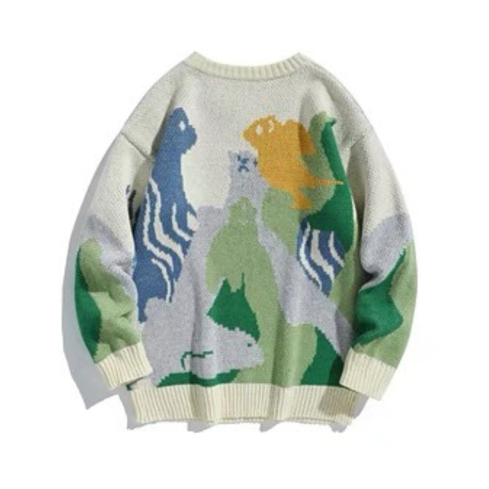 This sweater is made from a high quality wool and acrylic blend that is soft and cosy to wear. The knitted design features an adorable vintage pattern with colourful eyes and body to make you stand out from the crowd.