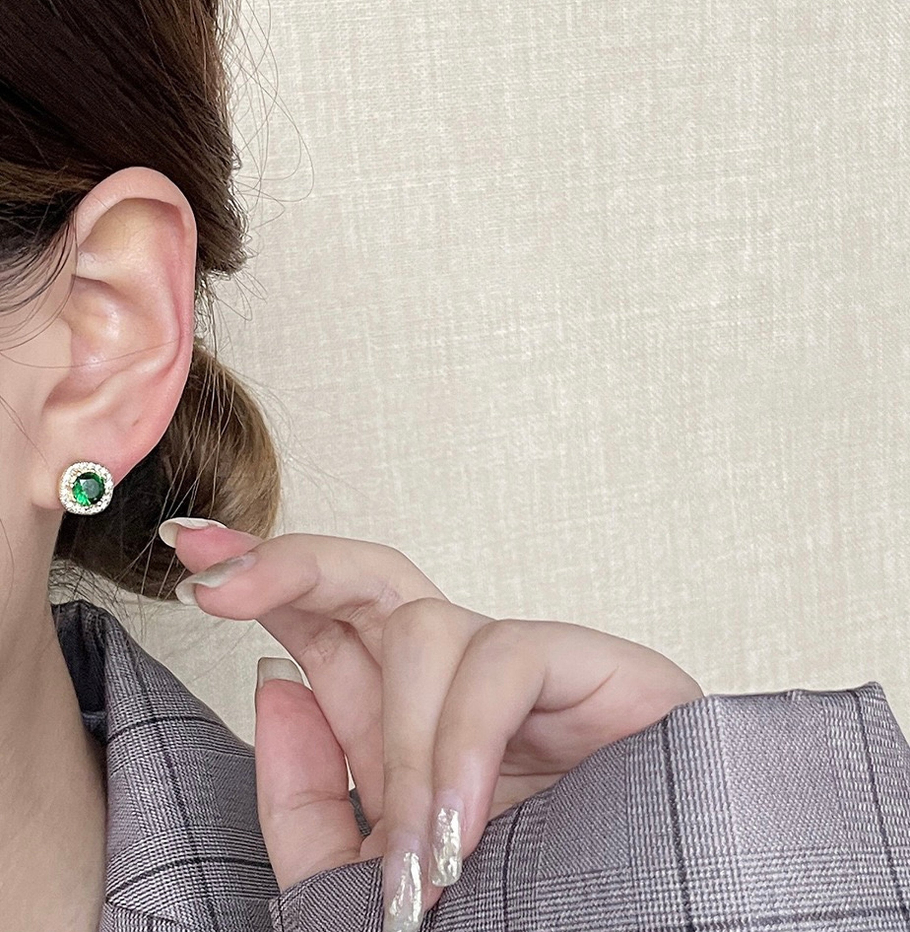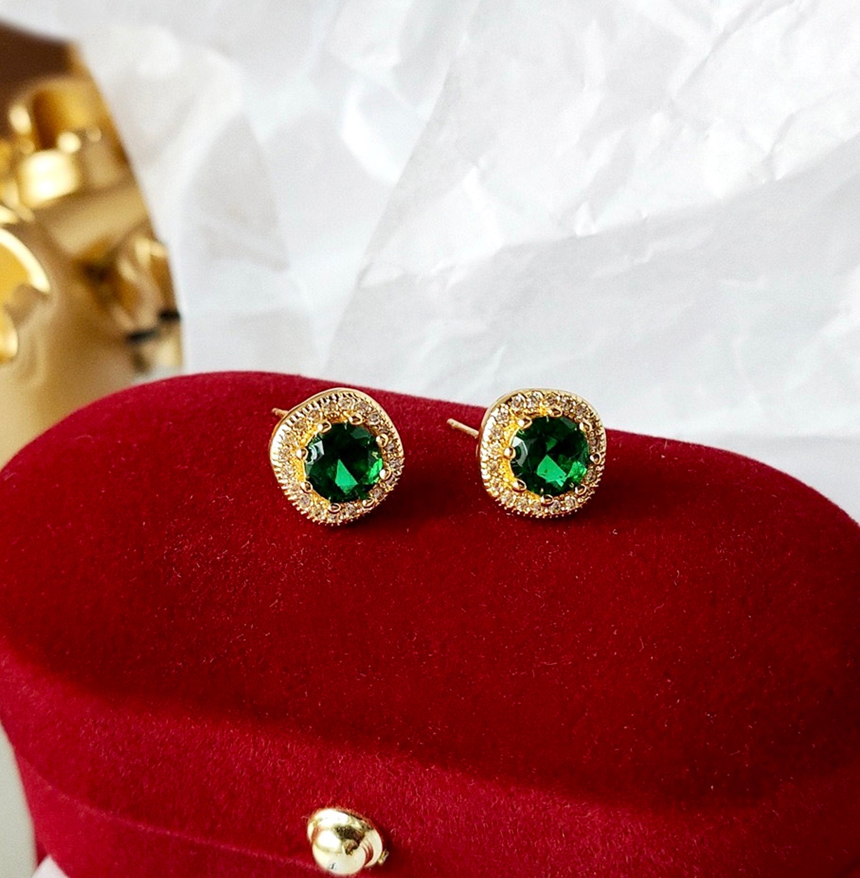 Dainty green emerald gold simple ear stud jewelry. your everyday classic luxury sparkles. simple yet exquisite. Cushion cut beautiful emerald green gemstone with delicate diamond crystal cz surrounded. super sparkly and glamorous. Vintage style halo gold lace design. looks elegant and timeless. We choose top quality stones. 100% handmade fine jewelry. gorgeous dainty earrings for everyday/weddings/parties or any occasions!