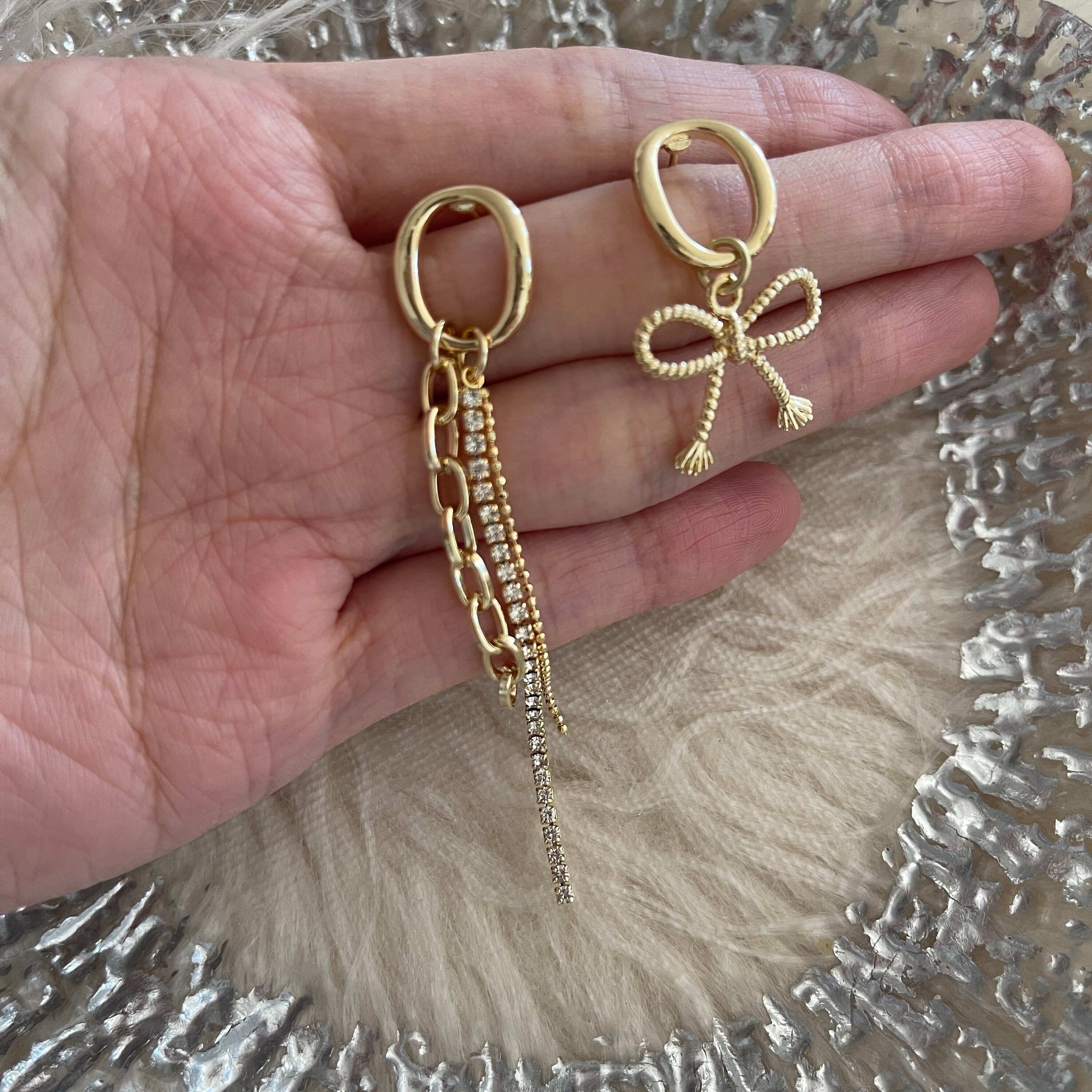 Cutest mismatch asymmetrical drop earrings - one side is 3 mismatched gold tassel chain dangle with circle hoop. super sparkly eye catching. the other side is delicate cute bow tie ribbon drop. punky cool streetwear style yet sweet and elegant. Perfect to mix and match. effortlessly elevate your look with dainty minimalist vibes! Handmade of gold vermeil sterling silver. hypoallergenic and good for sensitive skins. Gorgeous gifts idea for yourself and your loved one :)