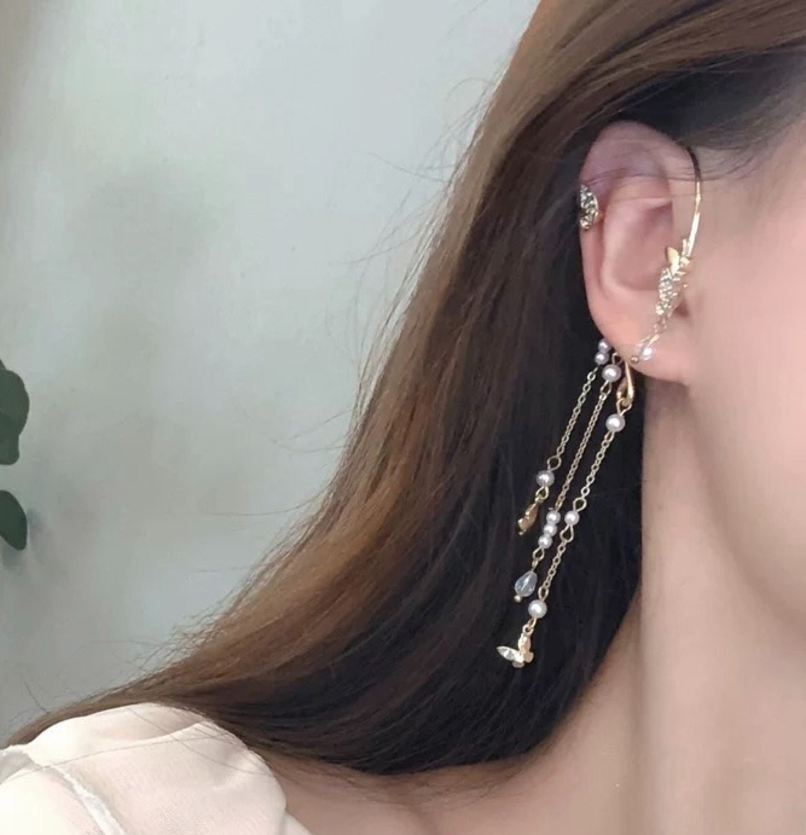 Unique handmade no piercing dangling ear wrap. ear cuff. ear climber. Delicate gold finish with dangling butterfly charm and pearl cluster tassel. It also has butterfly details on conch area. super cute yet with feminine accent. No ear hole necessary. easy to wear and pair at your personal fit preference. super convenient and elegant. Perfect as everyday jewelry. also looks gorgeous as party/bridal bridesmaid/wedding accessories! Sold as 1 piece. for left ear.