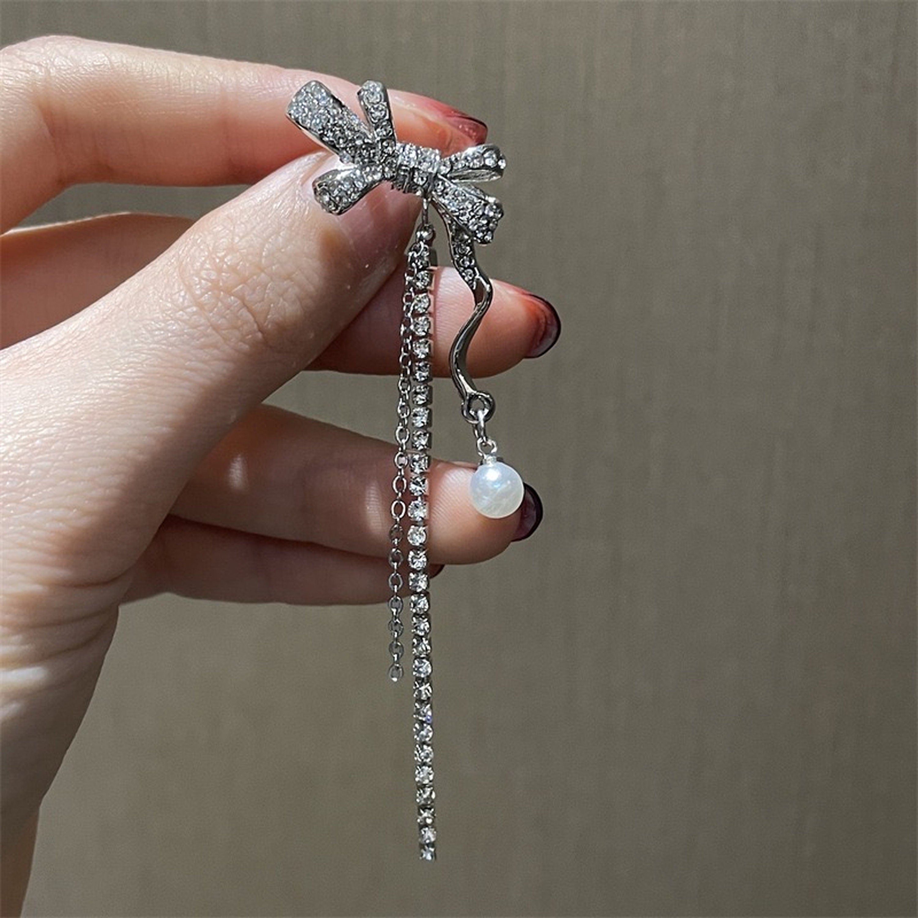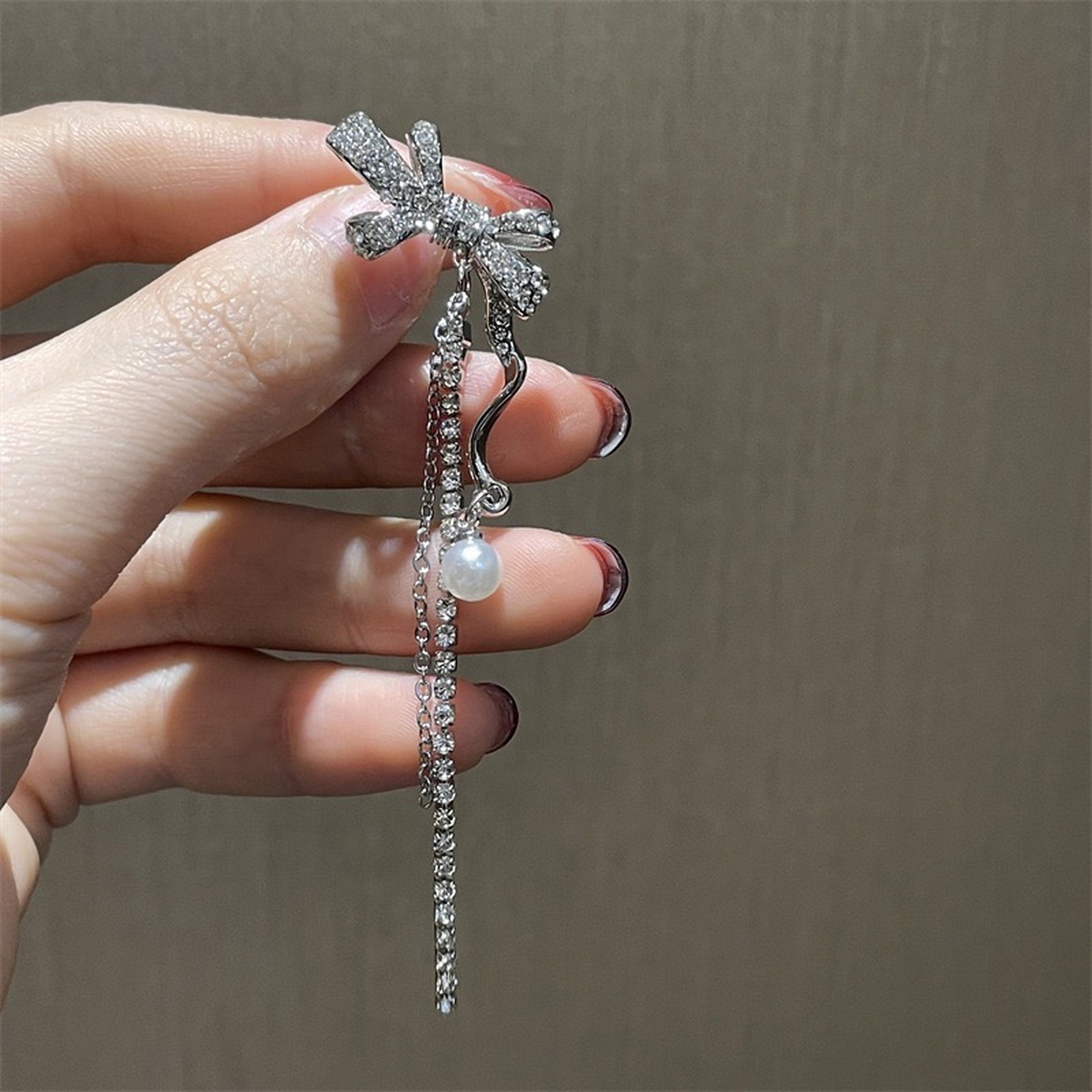 Sparkling no piercing silver ribbon ear cuff climber. with pearl and rhinestone dangles. Stylish punk street wear style. super chic and edgy. No ear hole necessary. easy to wear and adjust. Delicate cubic zircon paved on cute silver ribbon. Absolutely unique add on to your everyday outfit!