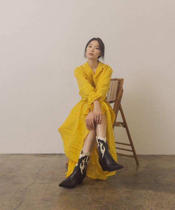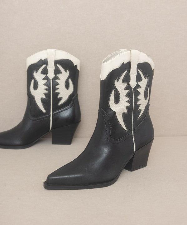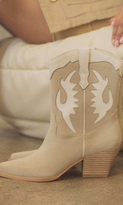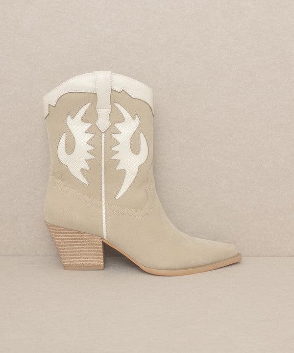 Meet the Oasis Society Houston - Layered Panel Cowboy Boots: where classic cowboy style meets contemporary attitude. These boots are a bold fashion choice. designed with multi-layered panels that evoke the spirit of the rodeo and stand out at any festival. With their distinctive Western charm. these boots make a powerful fashion statement.