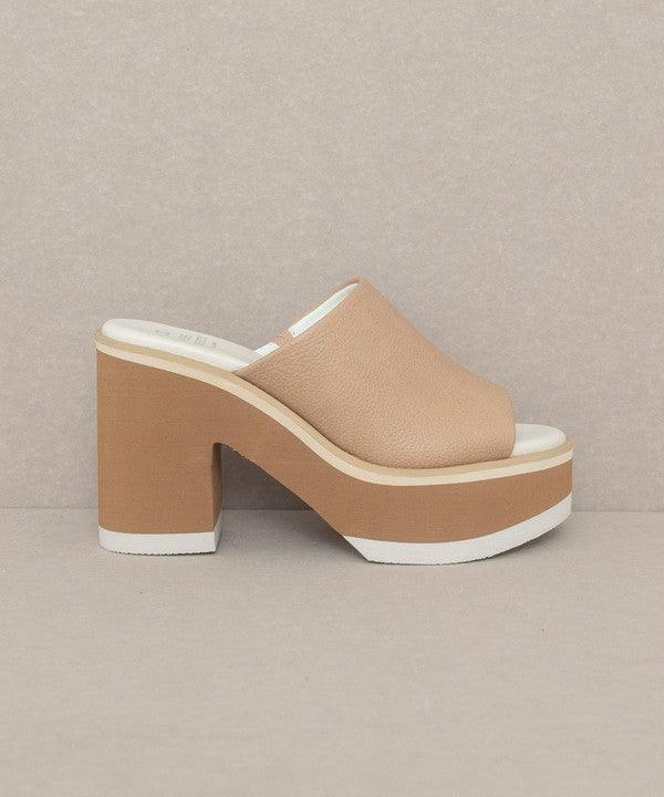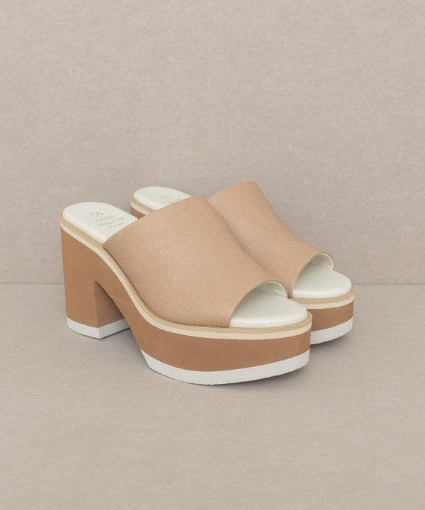 A multi-layered platform heeled slide that adds interest to every outfit.