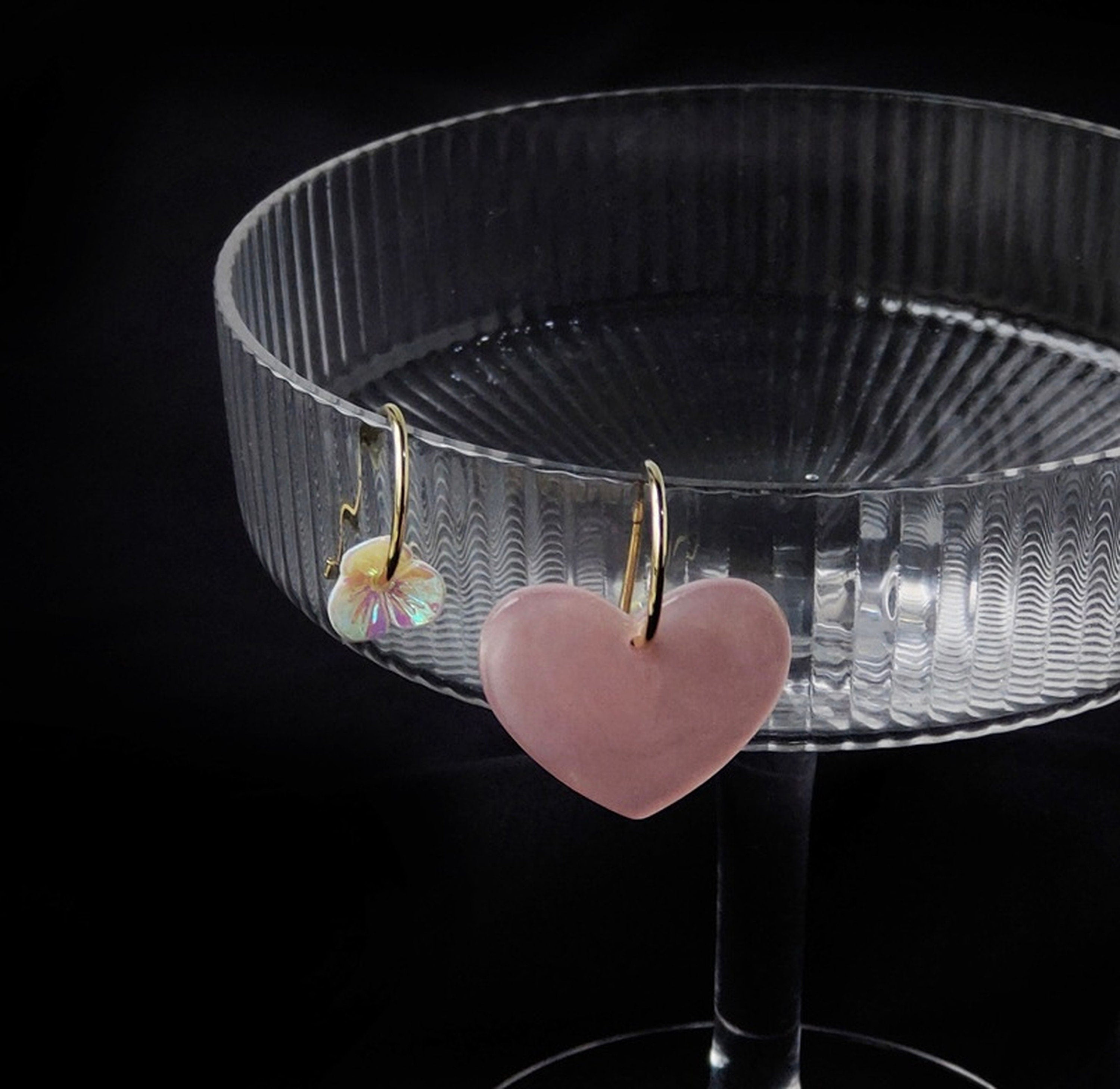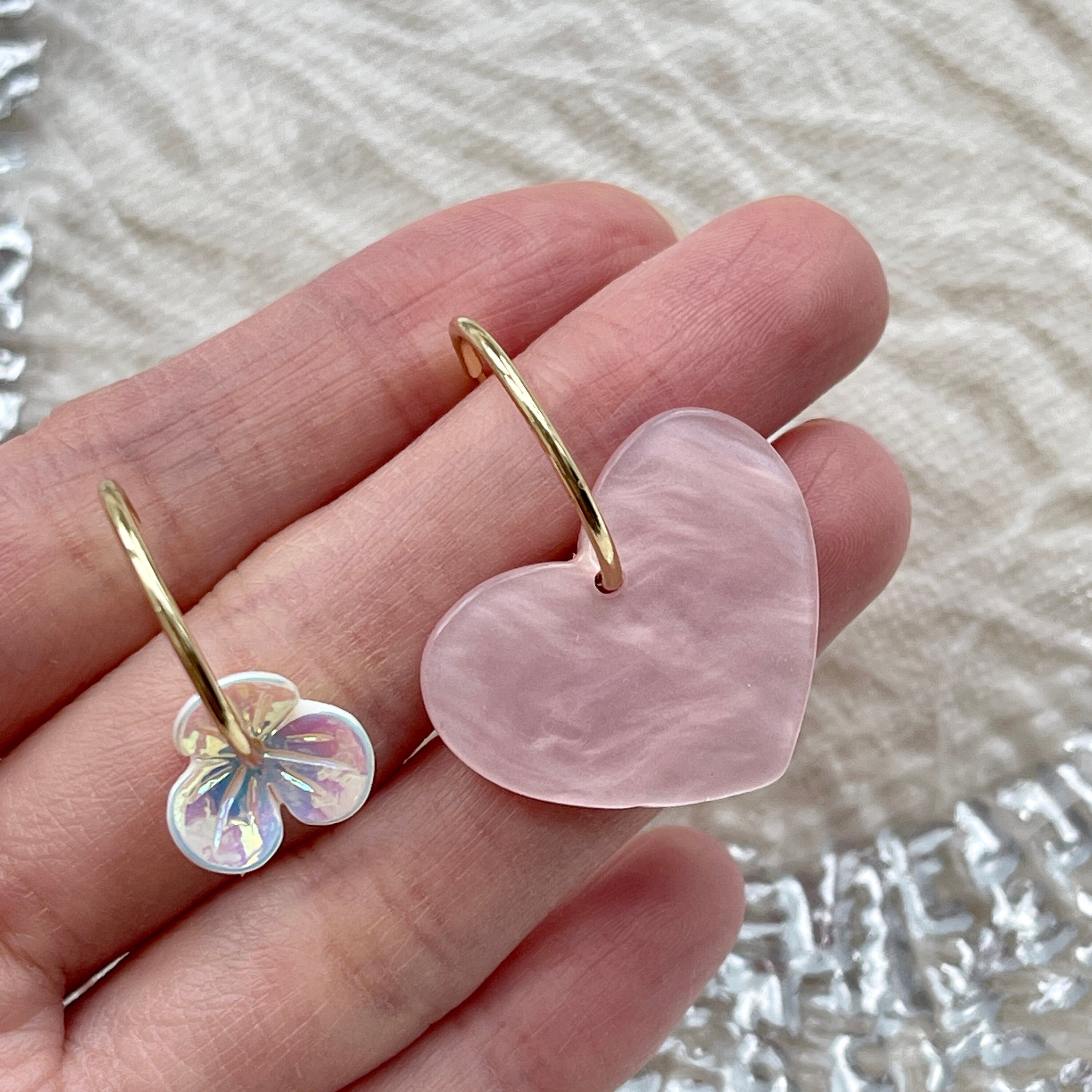 Adorable pinky heart and cherry flower mismatched dangle hoop earrings. one side is baby pink heart shaped acrylic. the other side is iridescent mother of pearl cherry blossom flower. Both of them are dangly with 14k gold plated sterling silver hoop huggies. a pair of rubber backing will be included. Looks girly and super cute. with romantic sparkly vibes!