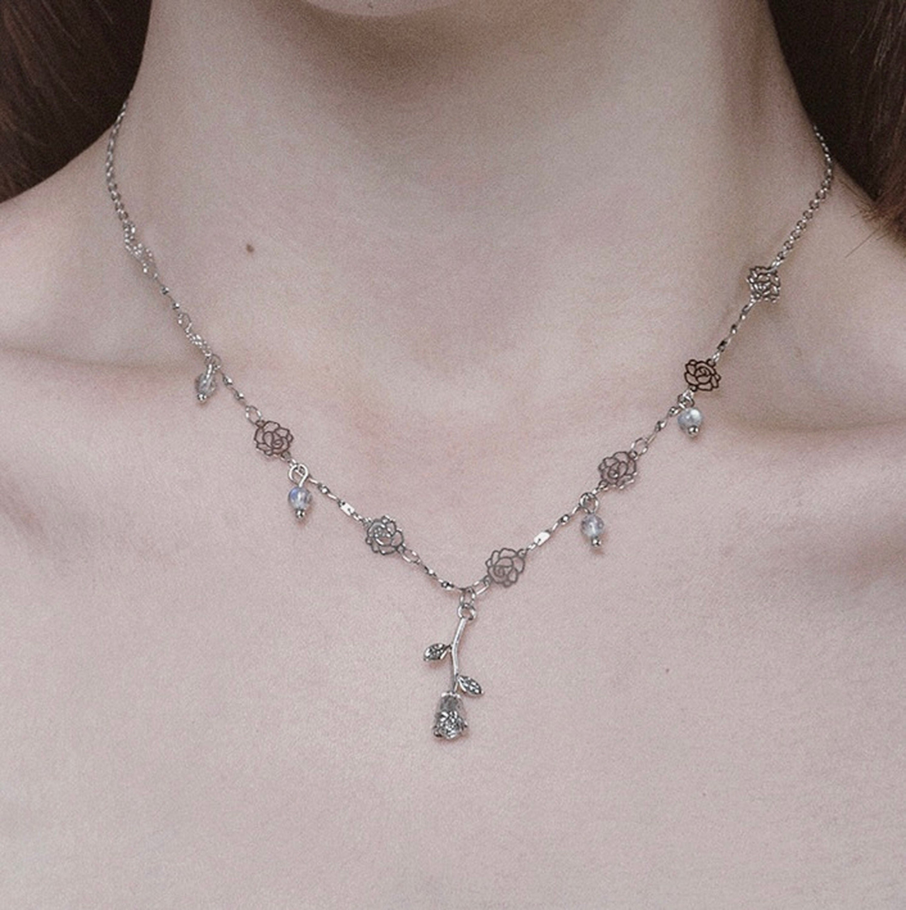 Silver rose flower layered necklace. 7 hallowed out silver rose and a 3D rose flower pendant. decorated with gray dangle balls in sterling silver finish. Retro punk accents with dainty floral design. super unique and romantic. Handmade exquisite piece. delicate high quality guaranteed.