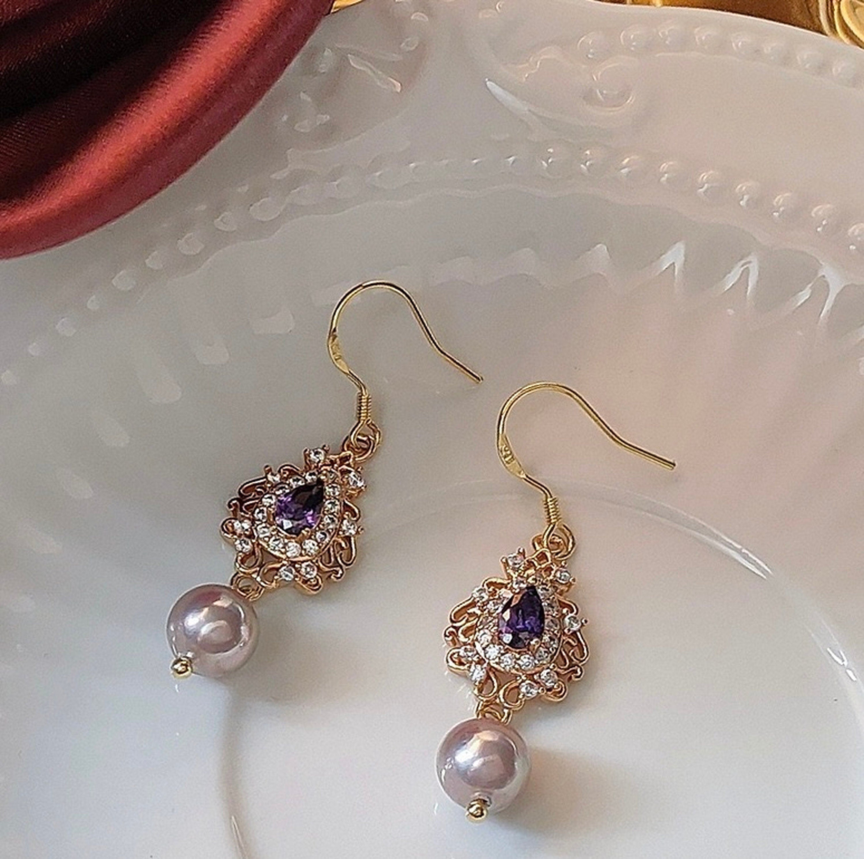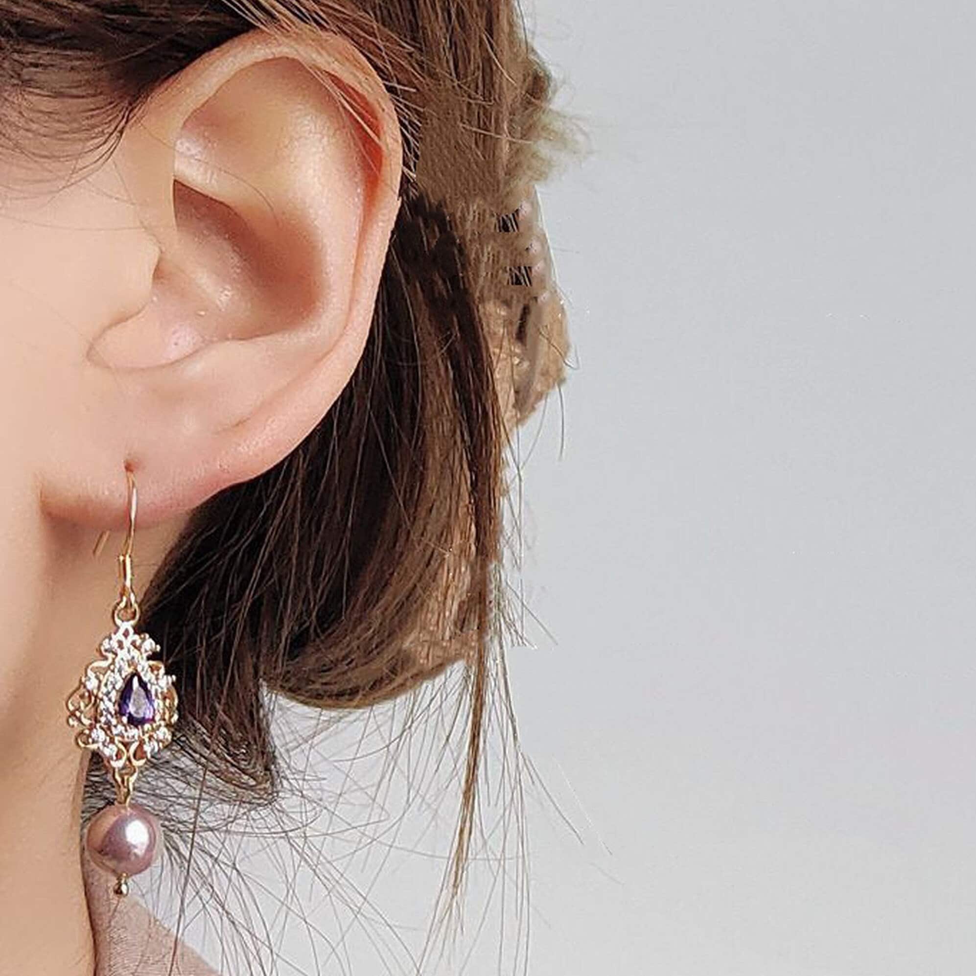 Exquisite luxury round purple pearl 14K gold lace dangle earrings. with gorgeous teardrop violet amethyst gemstone paved. Breath-taking elegant and delicate earrings. vintage luxurious accent. beautiful and unique. Handcrafted jewelry. top quality dainty earrings. one of the kind piece of art.