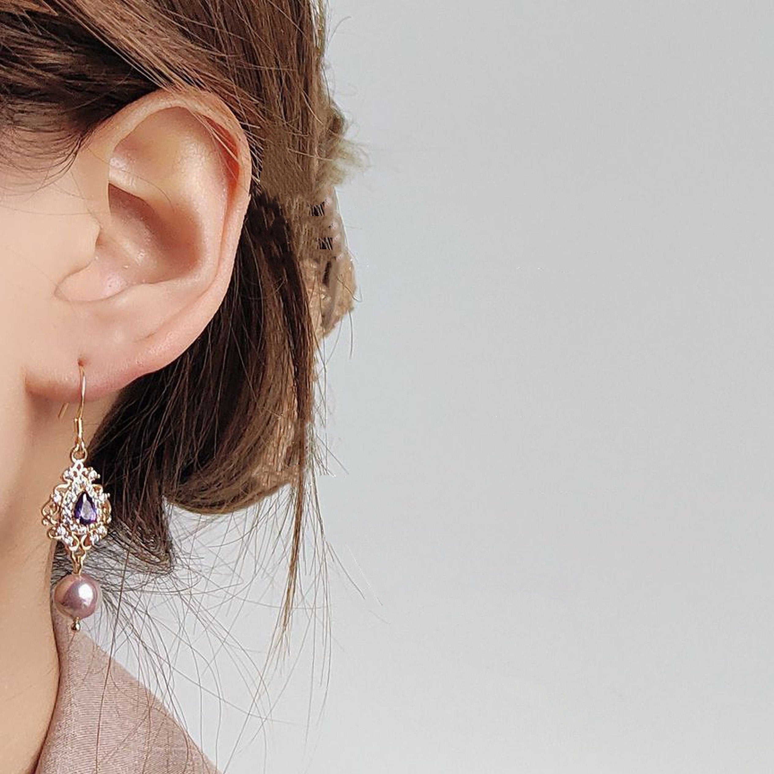 Featuring lustrous purple pearls set in a delicate gold lace design. these earrings are perfect for any occasion. from a night out on the town to a formal event. The unique combination of purple pearls and gold lace creates a romantic and feminine look that is sure to turn heads.