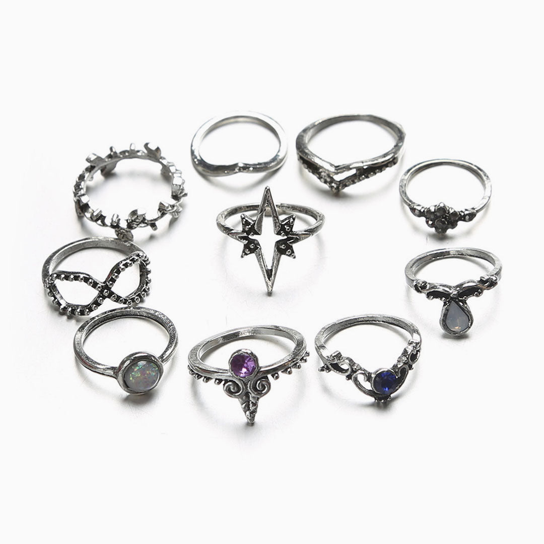 Add some glam with this stunning ten-piece ring set. Crafted from plated alloy and cubic zirconia. embellished with 10 different pieces for you. featuring looped bands accented in asymmetric shapes and embellished with glittering rhinestones. and finished with pullover styling. Find more unique women's ring sets and trendy jewelry sets in our boutique. and wear solo or stack with our other pieces for a vintage look.