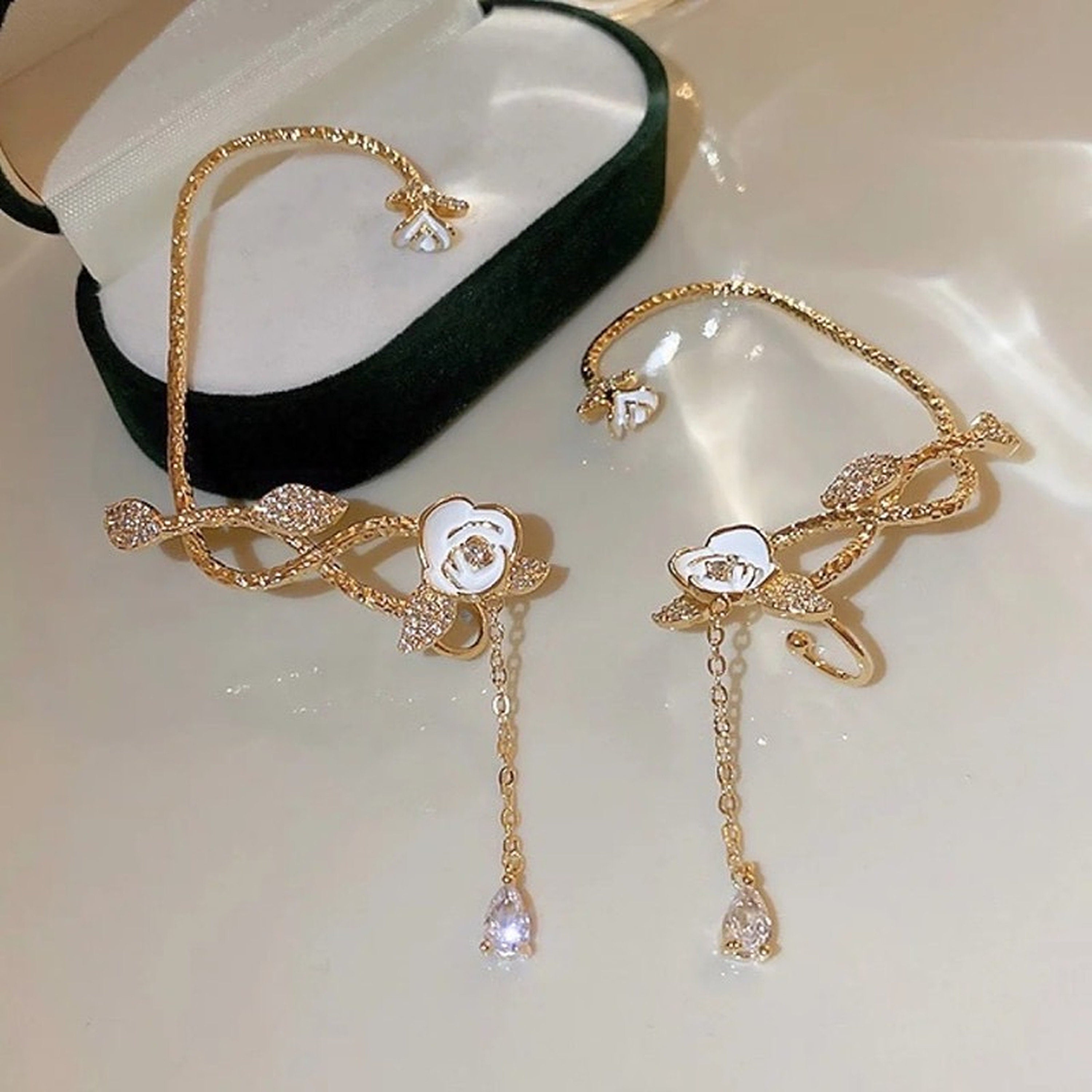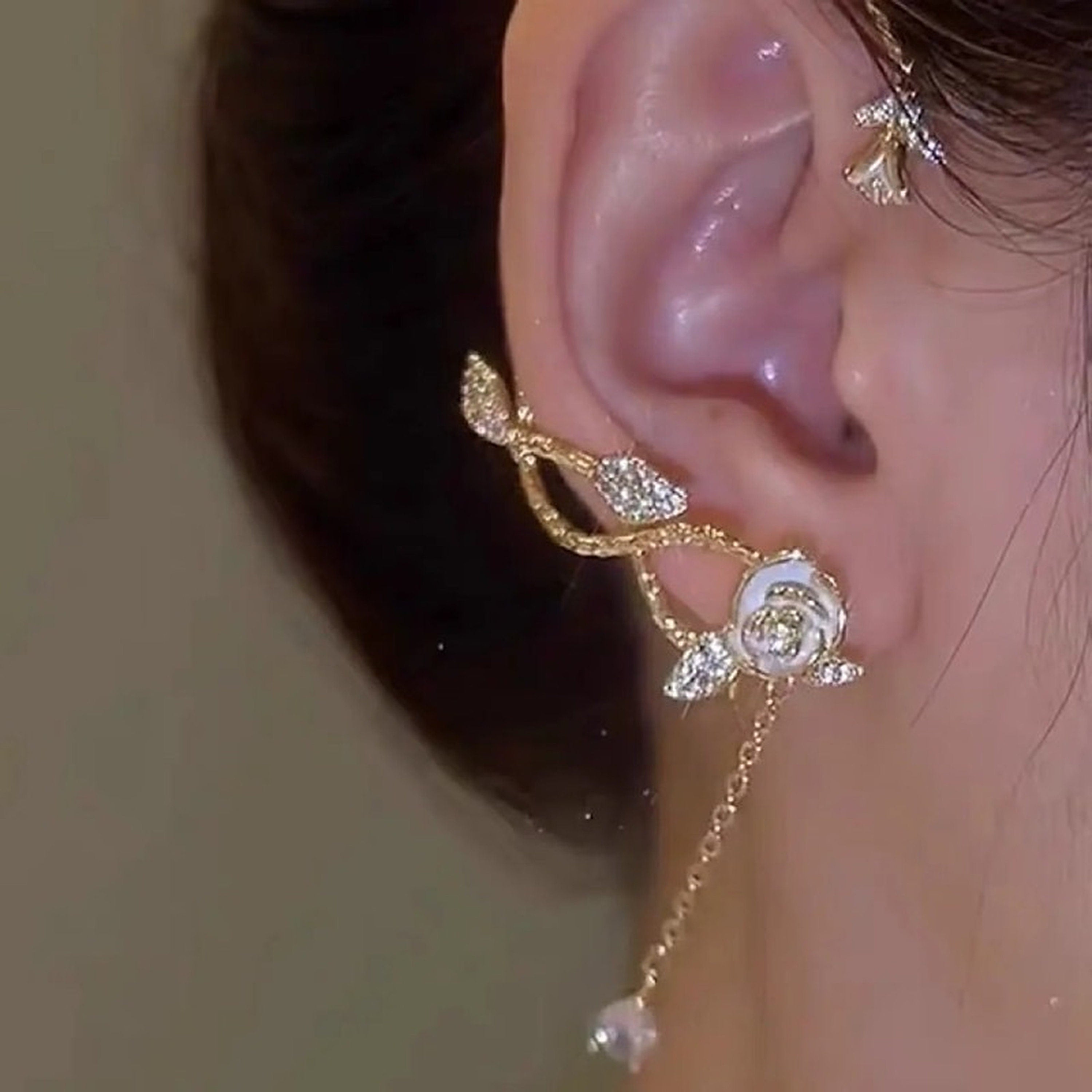 Beautiful and stunning sparkly fairycore earrings - no piercing gold rose vine ear wrap cuffs with crystal dangle. Full ear wrap climber crawler. gorgeous white rose details. exquisite gold texture. no ear hole necessary. easy to sit on your ear silhouette. very unique earrings that will be super eye catching! Looks stunning to wear 1 piece or a pair.