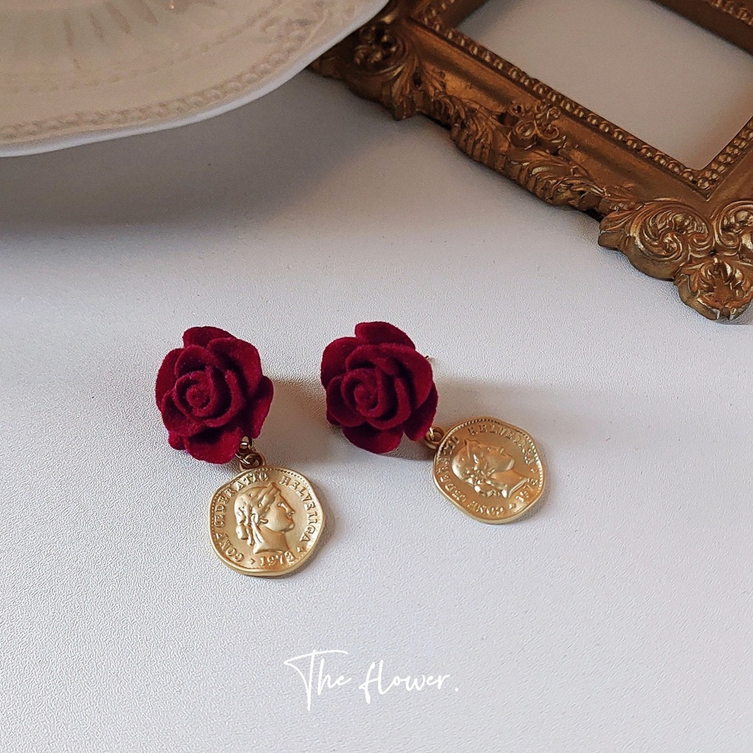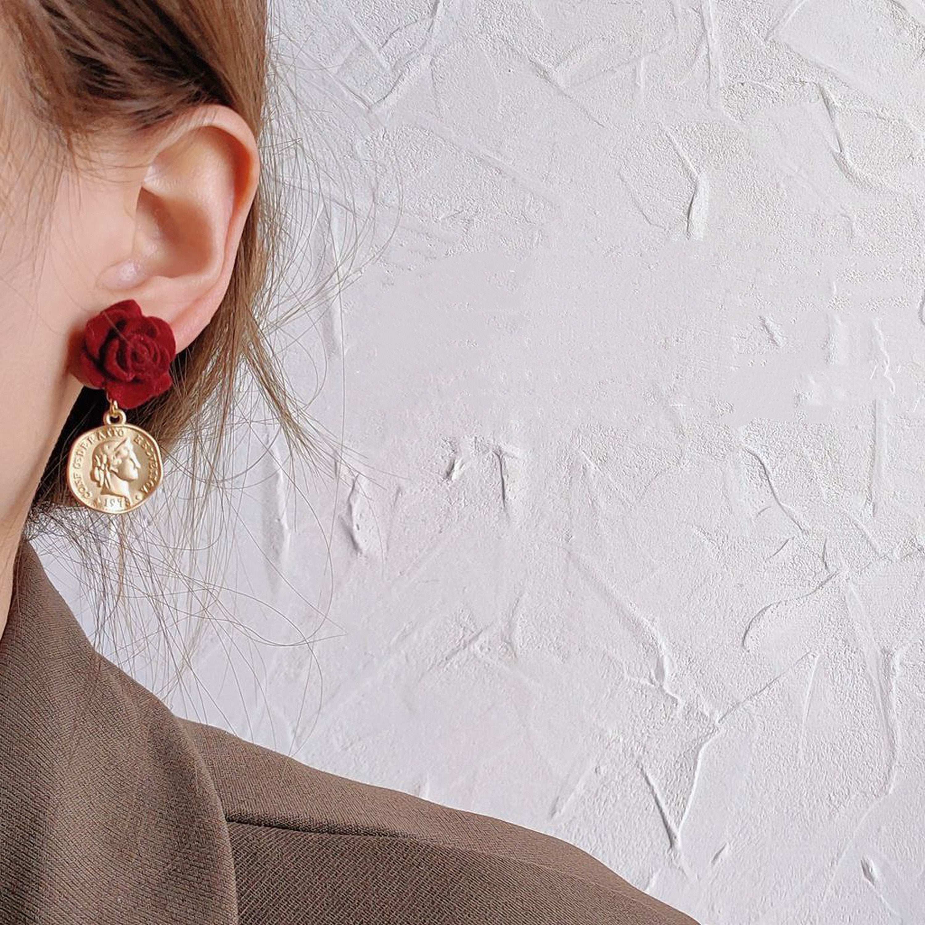 Handmade romantic style Beauty and Beast red velvet rose earrings. with round gold coin dangle. exquisite and gorgeous. Stunning red velvet flower gives you vintage Gatsby vibes. while the gold coin dangle adds some Victorian antique accents. We choose the best quality flocking velvet to create the beautiful rose flower. they looks like real rose in picture or in person!