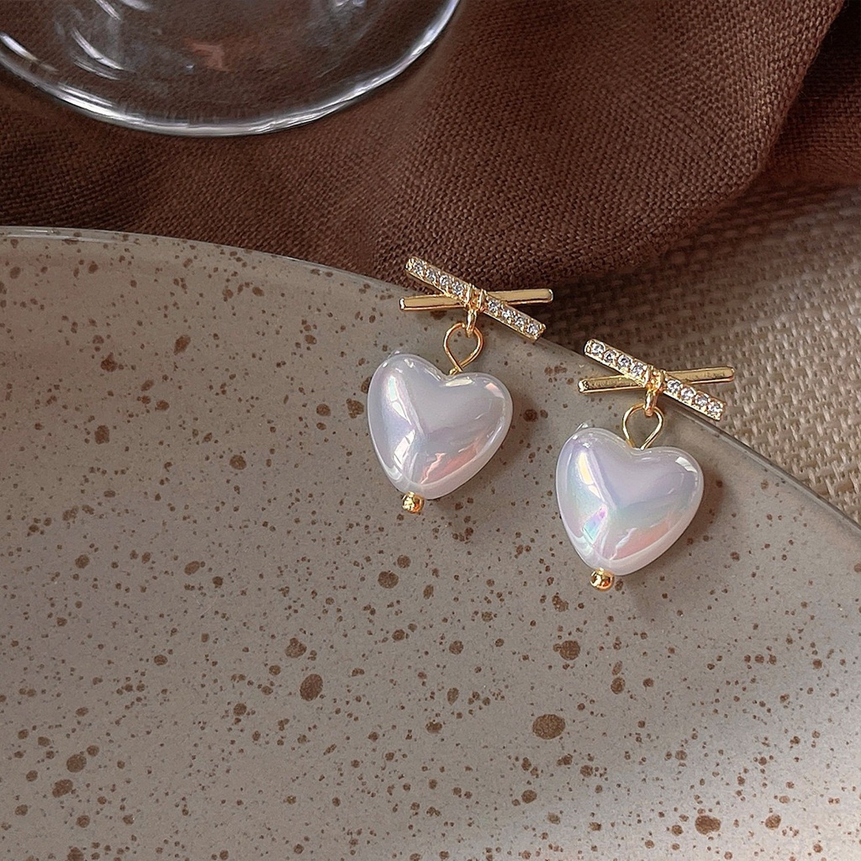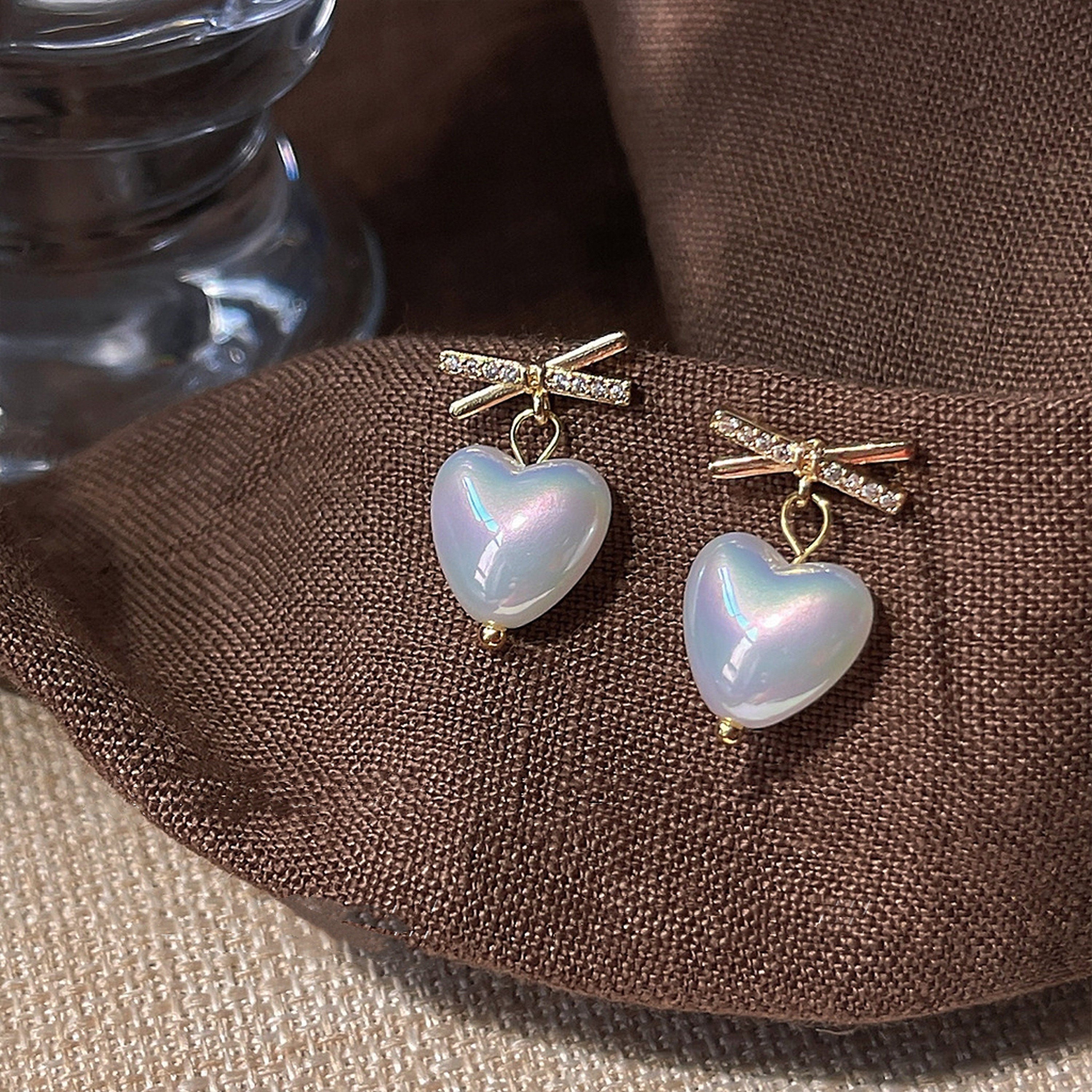 Romantic luxury girly vibes - elegant heart shaped pearl gold bow ribbon earrings. Super cute and feminine. We use unique iridescent rainbow shimmery baroque pearl to make this beautiful earrings. gold bow ribbon with sparkly cubic zirconia embedded. Dainty sweetheart earrings for your everyday jewelry collection. also perfect as wedding/bridesmaid/party earrings!