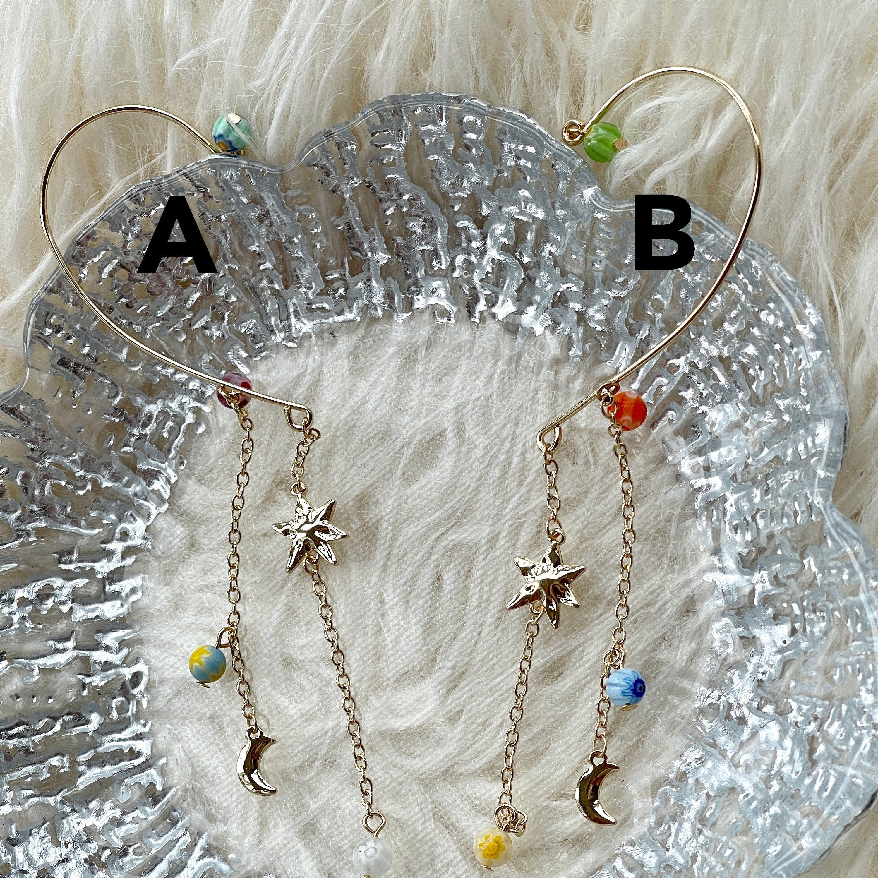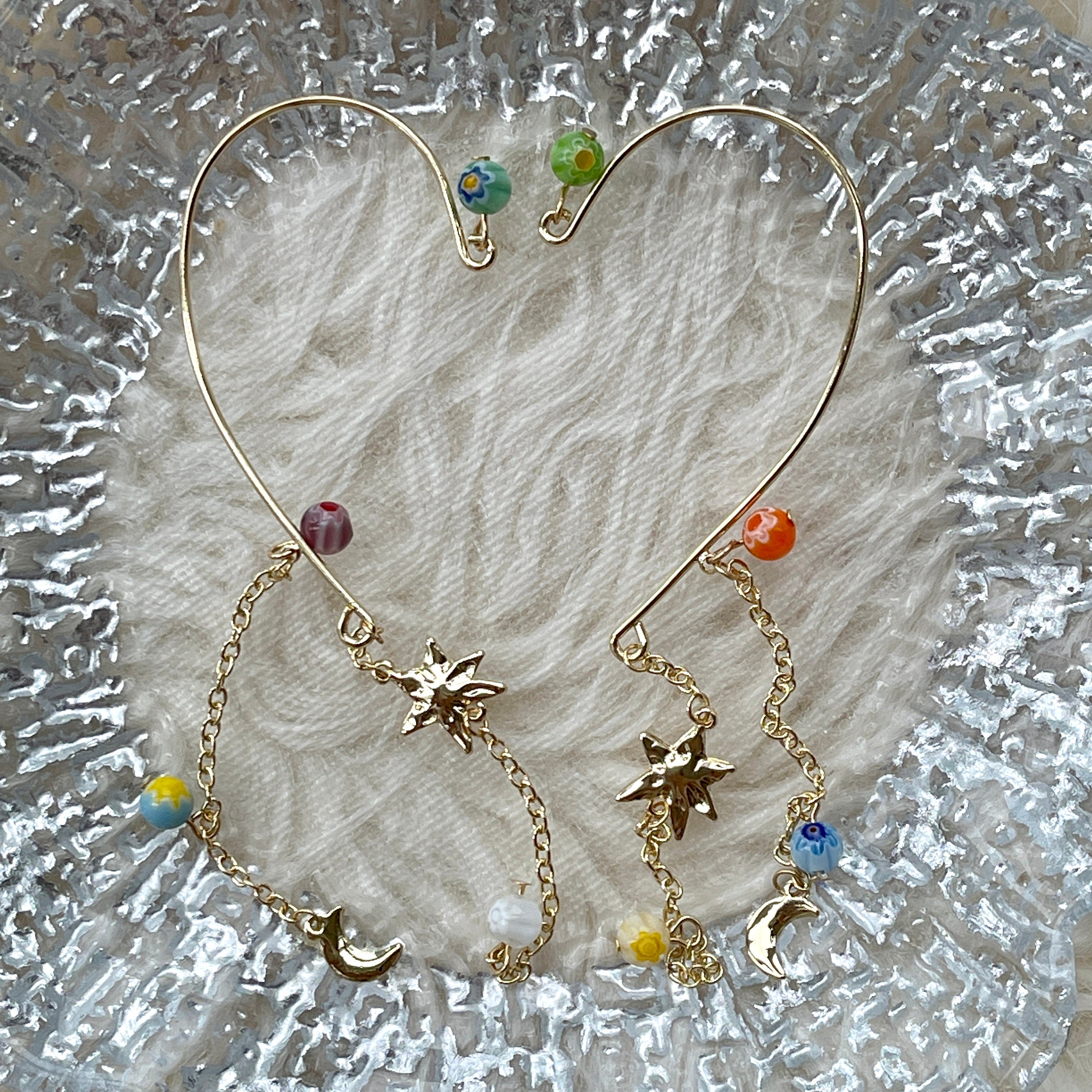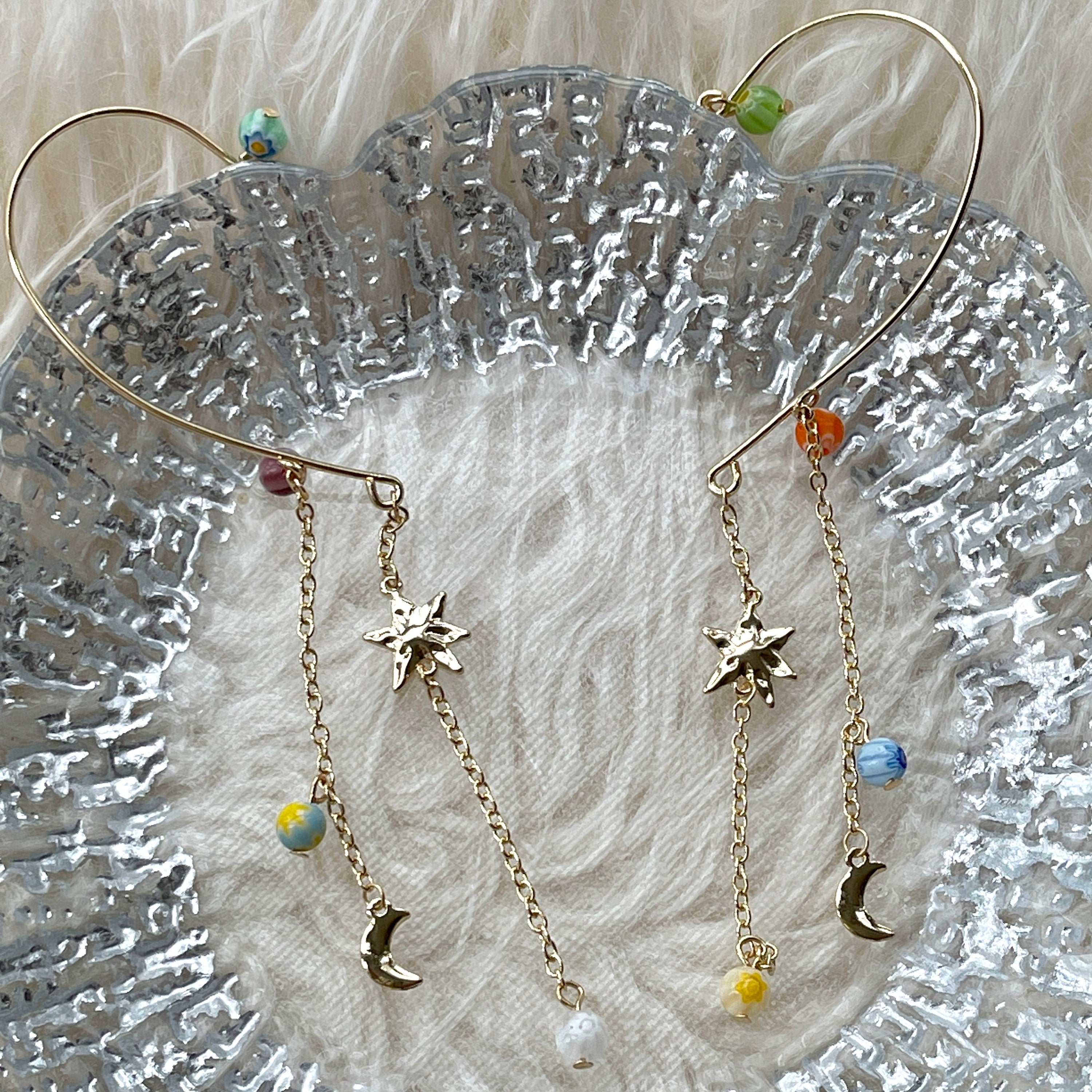 Creative rainbow color no piercing gold celestial ear wrap. ear cuff. Golden starburst crescent moon dangles. 4 multicolored floral pattern beaded drops. super cute and unique! Rainbow beads are randomly mixed and matched on ear wrap. 2 choices of shade available.