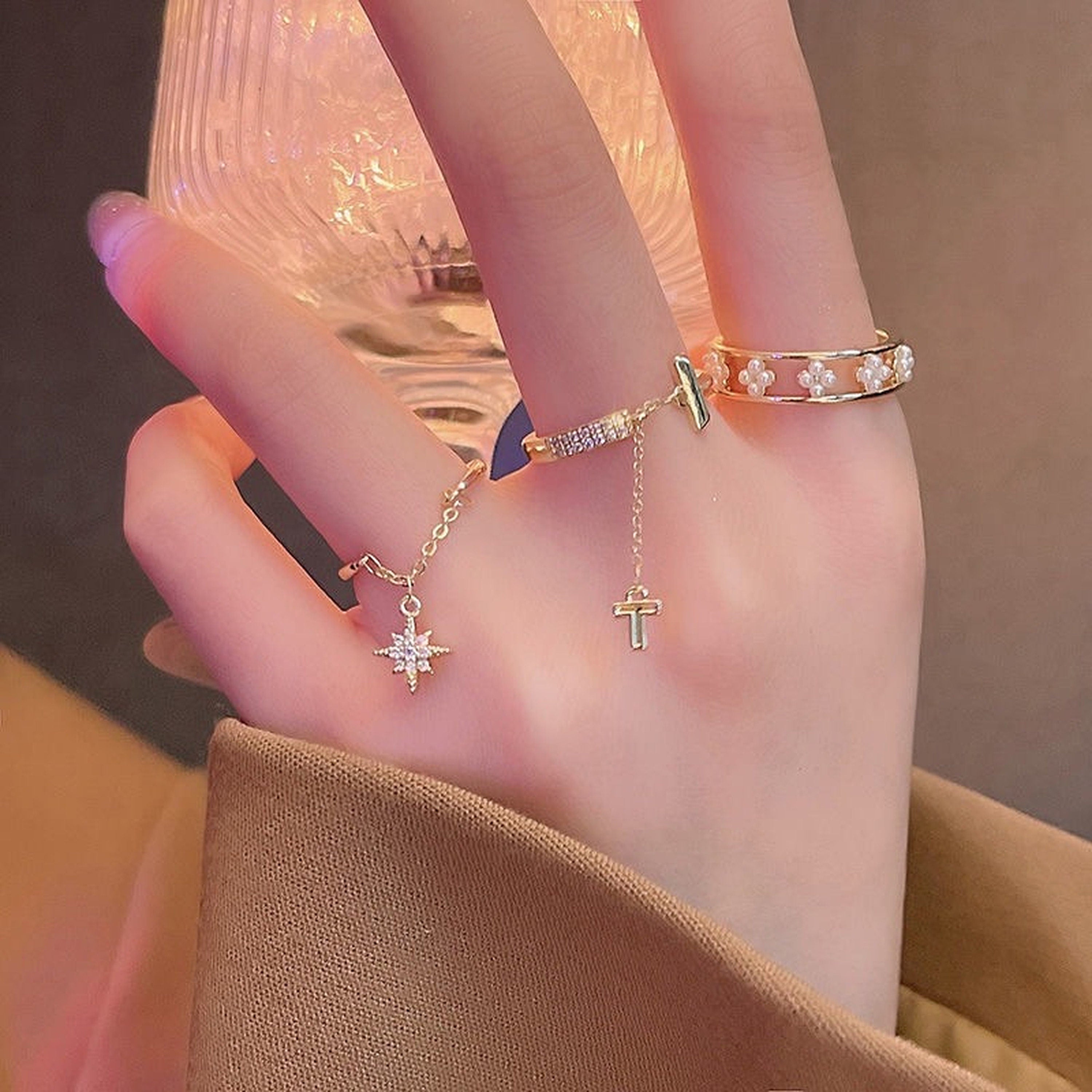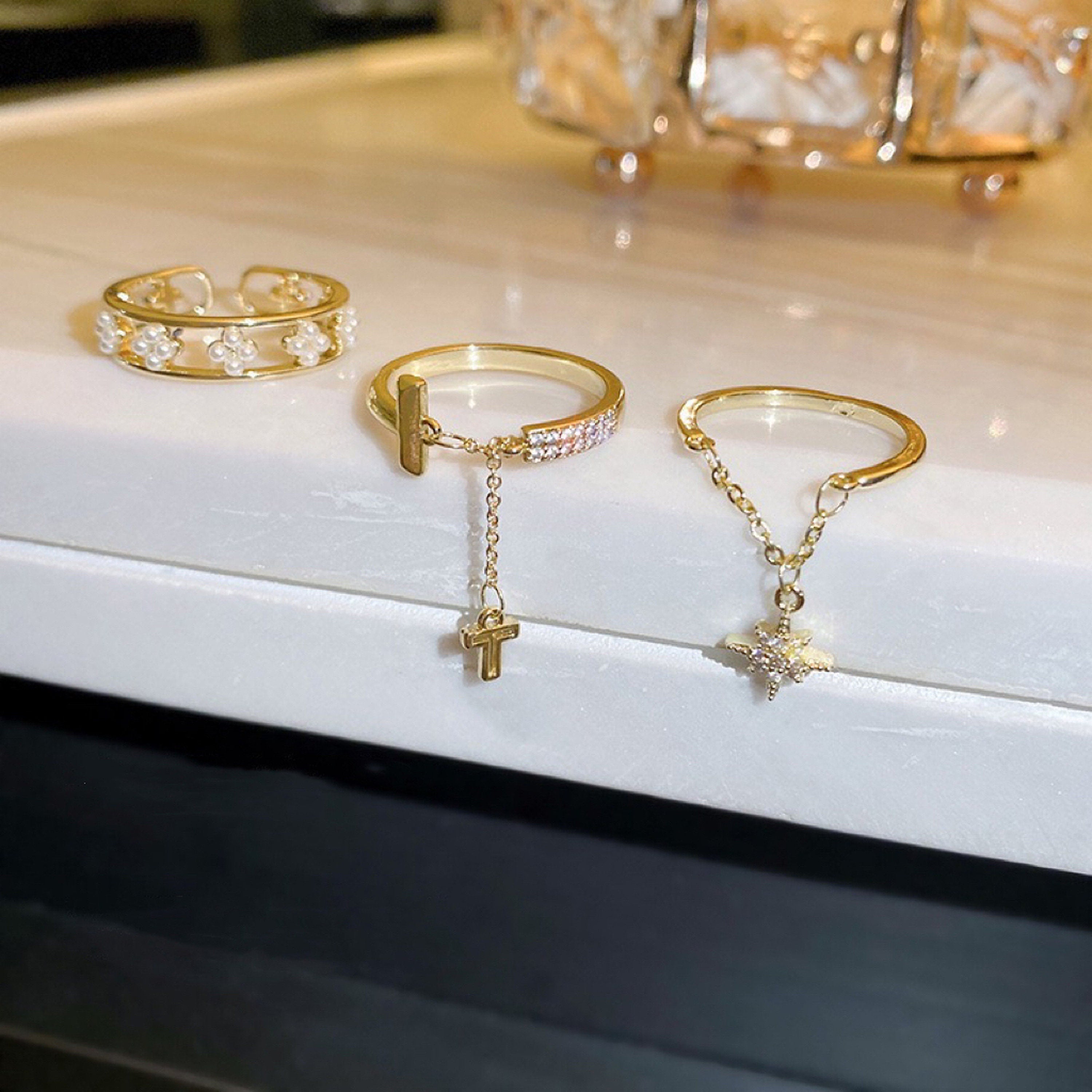 Our new design is on listing now - Very unique rings for you to enjoy the fun of jewelry stacking! Dainty dangling chain rings with cute pendant. open adjustable band makes them easy to adjust on any finger and any location on fingers. 3 Styles of design available: Gold open band with north star dangle chain/ Double layered gold band with pearl cluster lace/ Gold open band with T dangle chain. perfect for mix and match. Creative convenient fashion to complete your unique style everyday /p>
