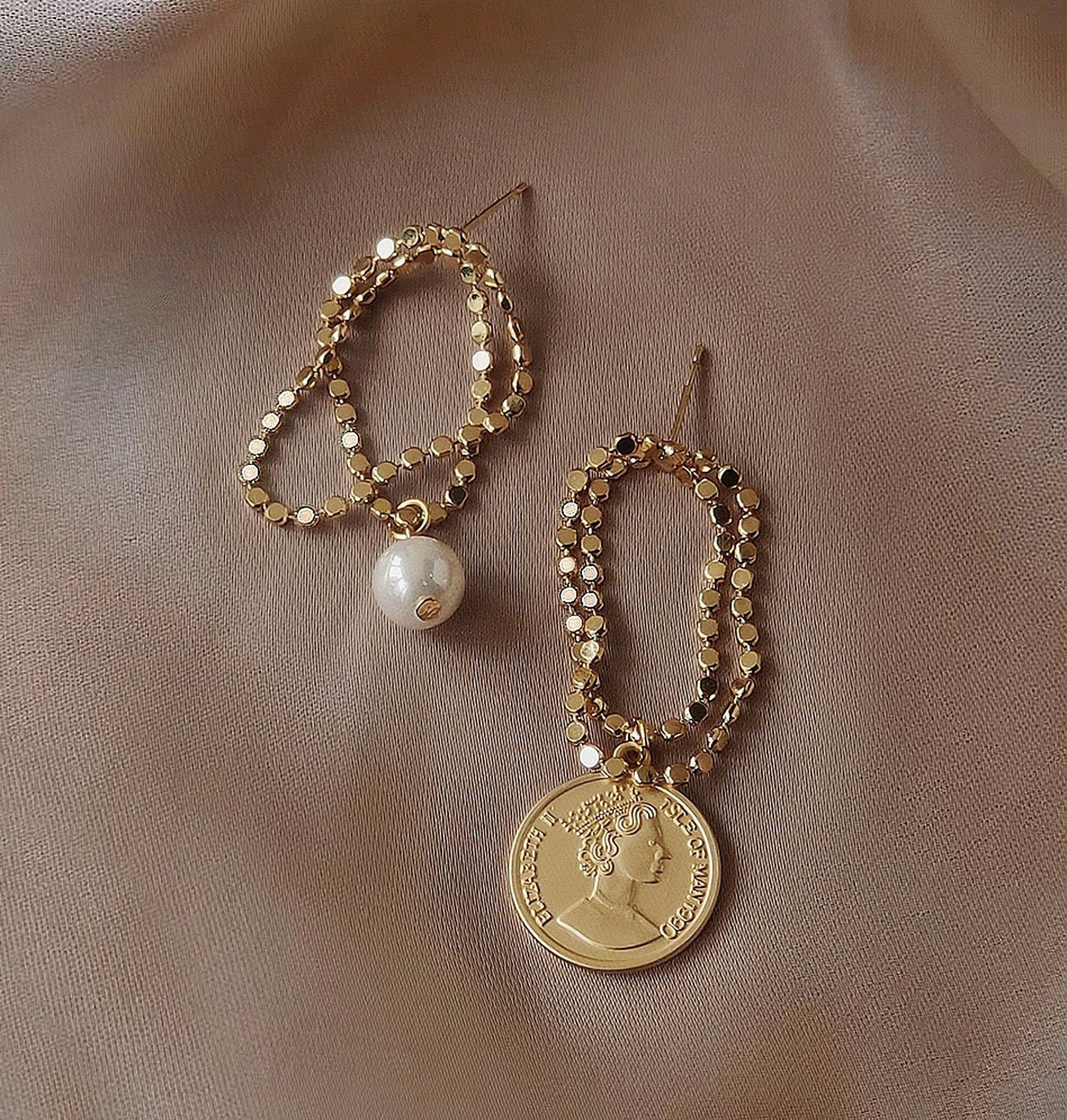 Our newest design gold coin earrings will be a perfect addition to your everyday chic jewelry collection. Delicate 14K gold roman coin medal charm with gold chain loop tassel. mismatched with round pearl drop dangle. unique stylist fashion. One of the kind dainty jewelry to elevate your edgy looks!