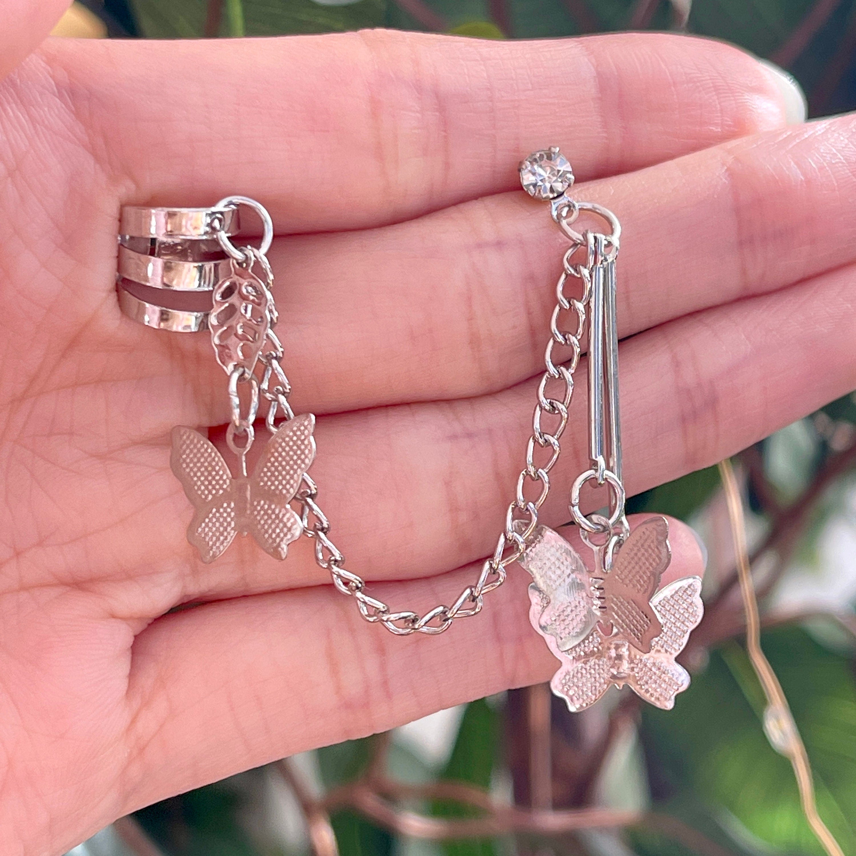Trendy silver butterfly dangle tassel ear cuff wrap. ear climber crawler. helix earrings. Multi layering butterflies. super delicate and unique. Gothic punk style. unique ear jewelry that will elevate your stylish fashion vibes. Sold as 1 piece. works for both ears.