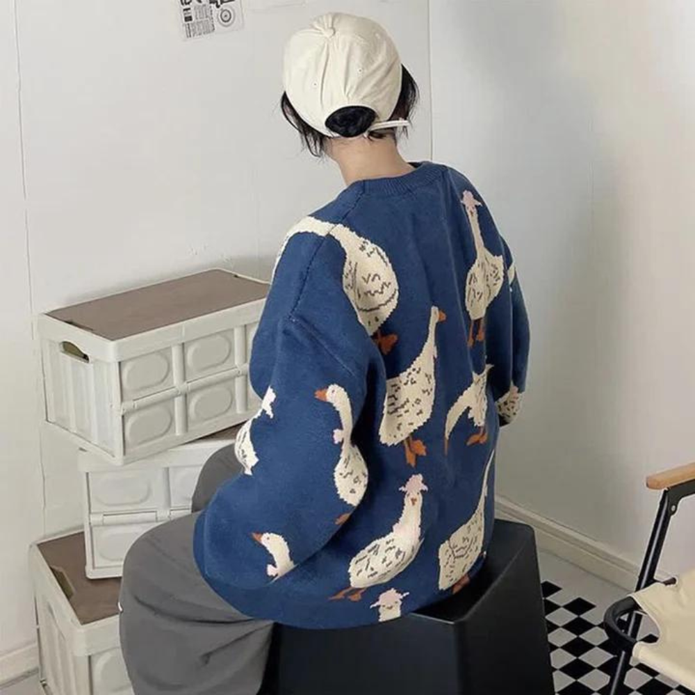 The sweater features a charming duck pattern knit into the fabric. adding a touch of whimsy and playfulness to your outfit. The soft and comfortable fabric is made of a blend of high-quality materials. ensuring that it will stand up to regular wear and washing.