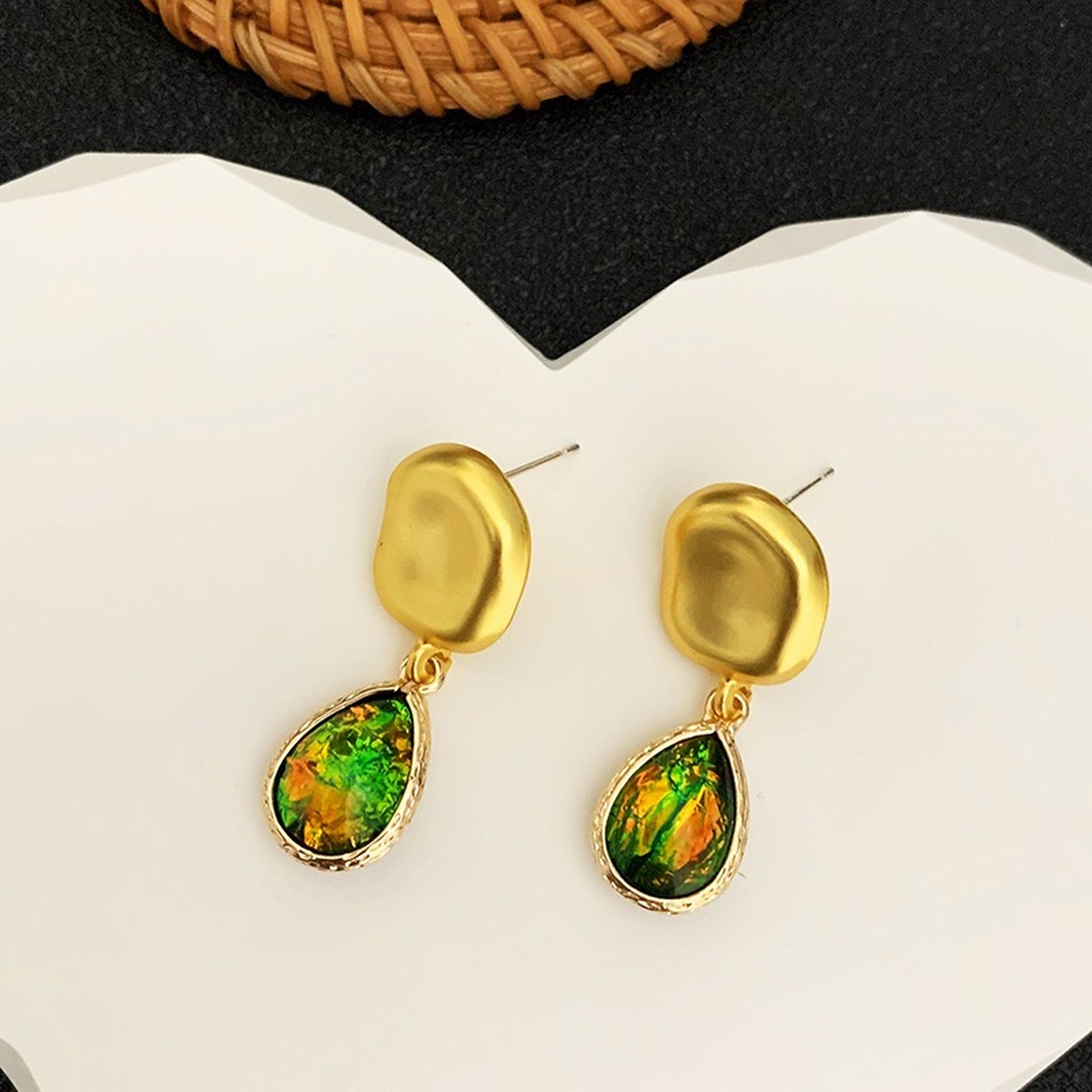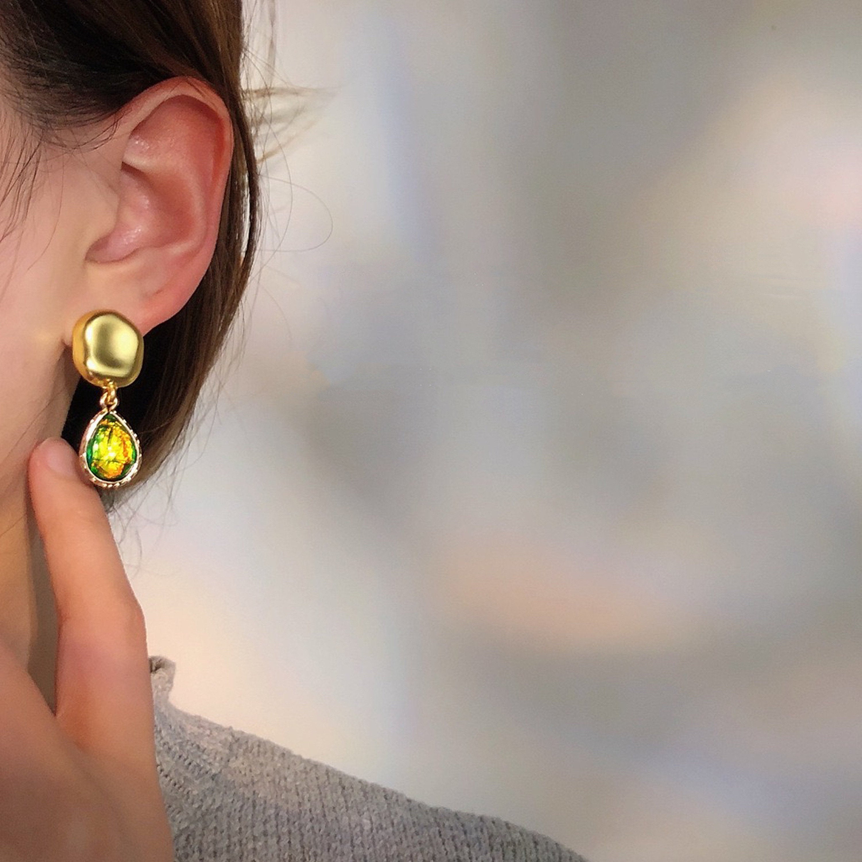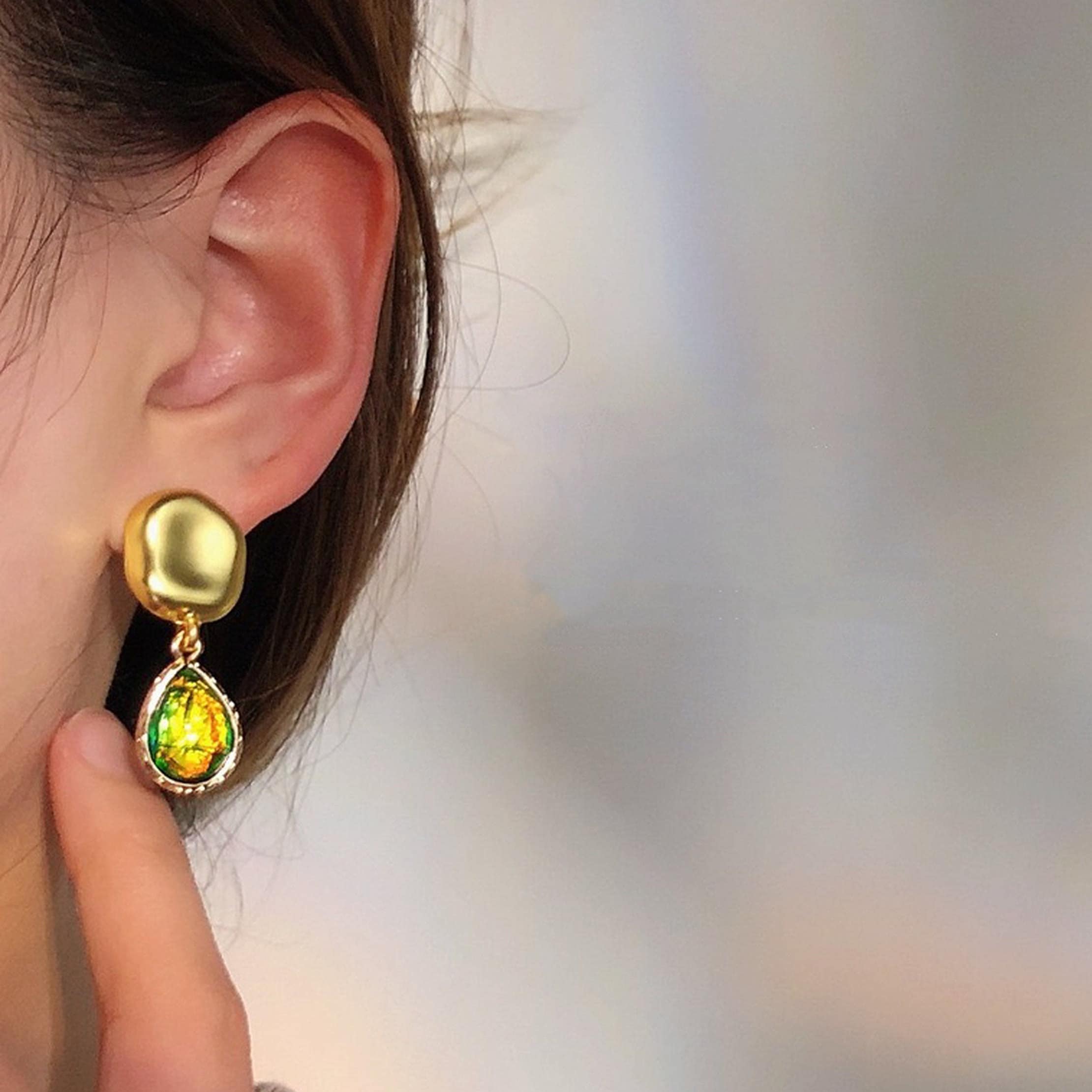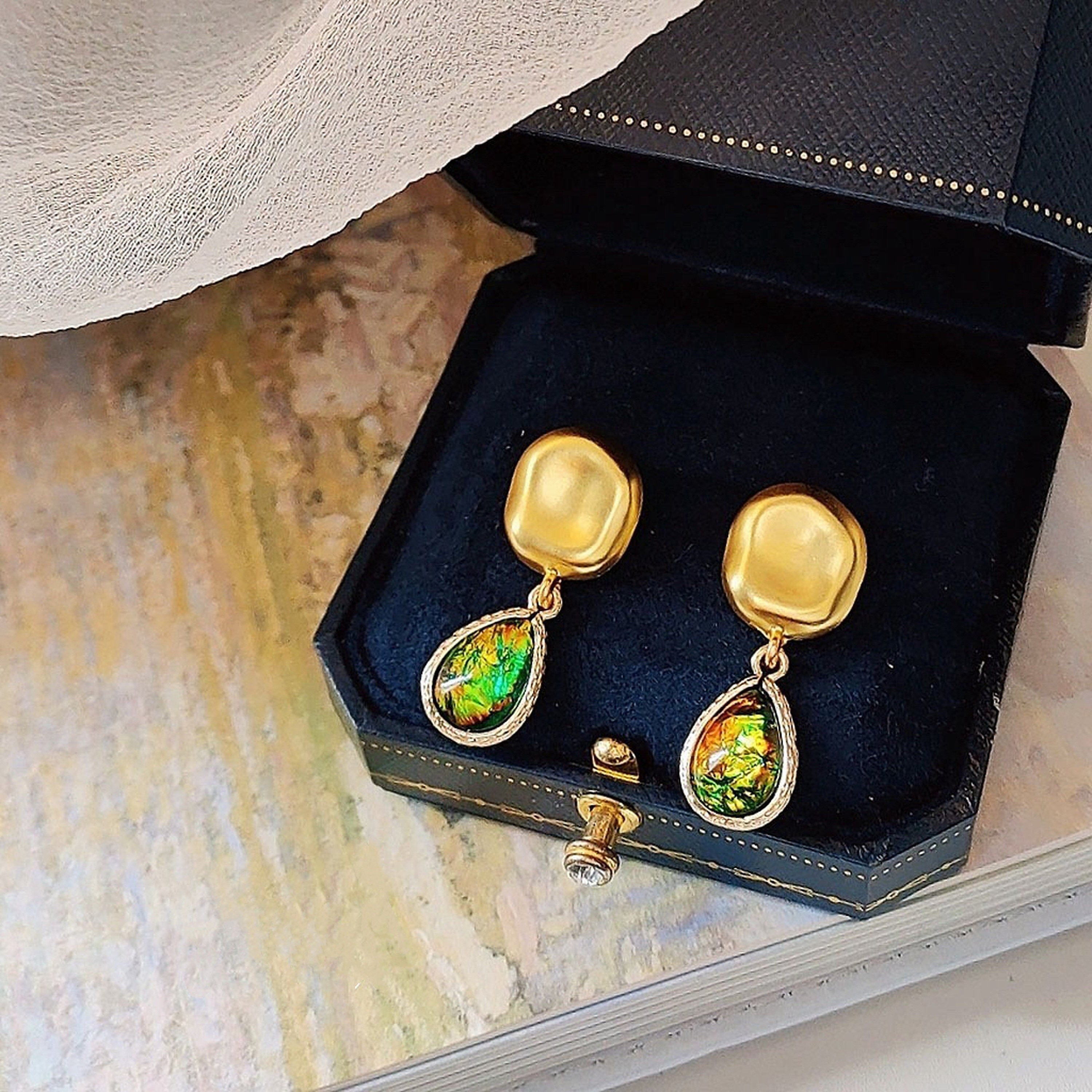 Unique iridescent emerald green shell teardrop earrings. antique gold tone stud. We choose the abalone shell to make this special earrings. every piece of shell is in unique pattern. they sparkling beautifully under different angles and lights. Matches perfectly with squared shaped matte antique gold stud. looks very elegant in addition to fashionable vintage vibes.