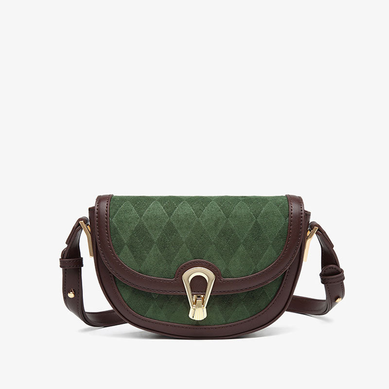 This cross-body bag is perfect to take along from weekend-long festivals to special nights out. Crafted with faux suede. imitated leather and blend alloy. embellished with diamond shaped patterns. featuring a structured shape embodied with leather edges. a roomy main compartment framed with an interior zipped pocket and an exposed zipper. a fold-over top accented with a metallic loop closure and an embossed shell detail. ending up with an adjustable shoulder strap. Find more trendy women's retro shoulder bags or unique bags in our boutique. and carry it with a nostalgic dress for a casual look!