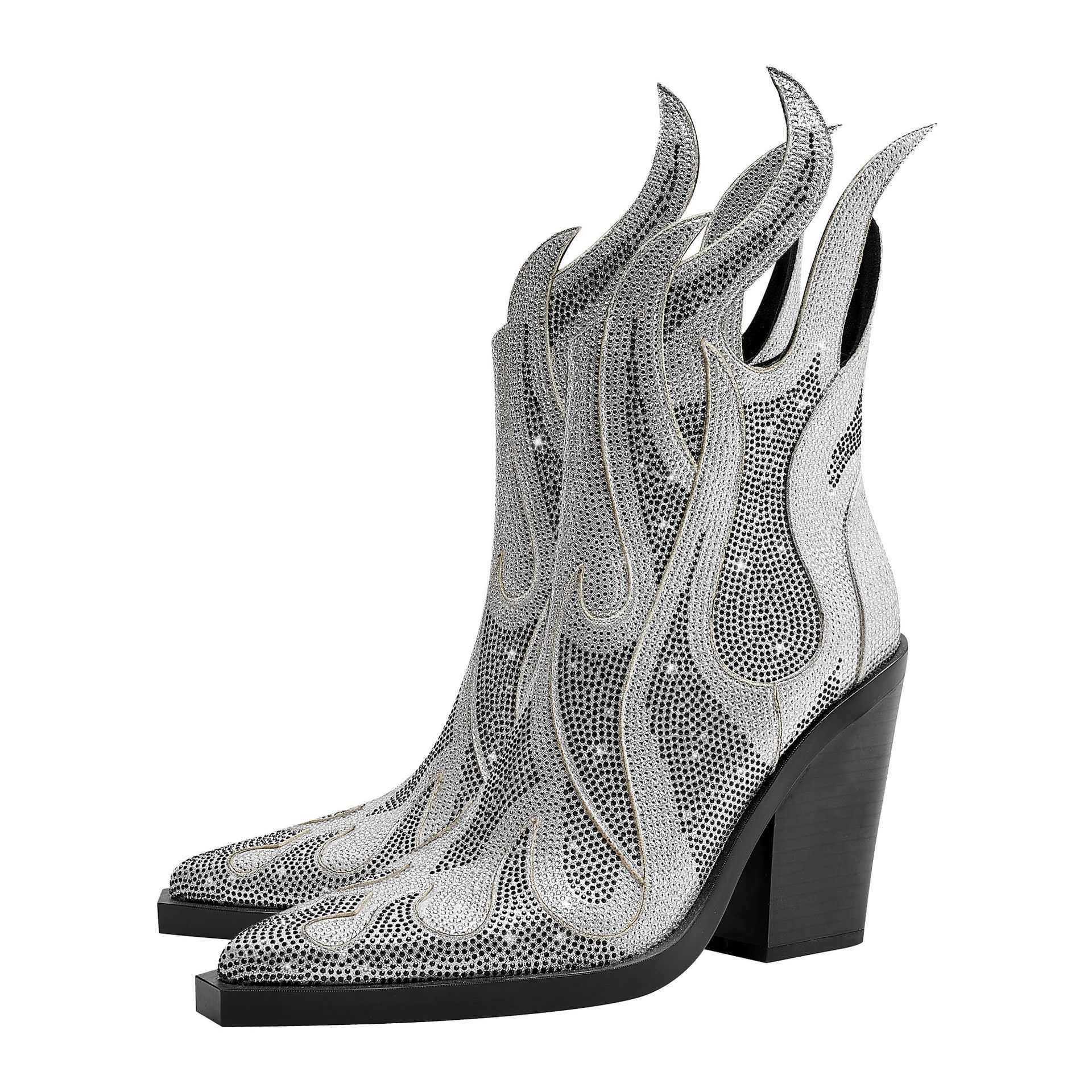 Set your style on fire with these luxurious rock chic cowboy boots. with flame designs up the ankle in rhinestone trim. and a square toe. Pull of the western look and have heads turning. European Sizing with Microfiber upper material.
